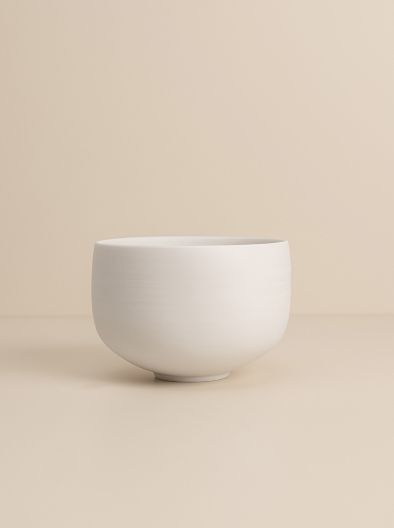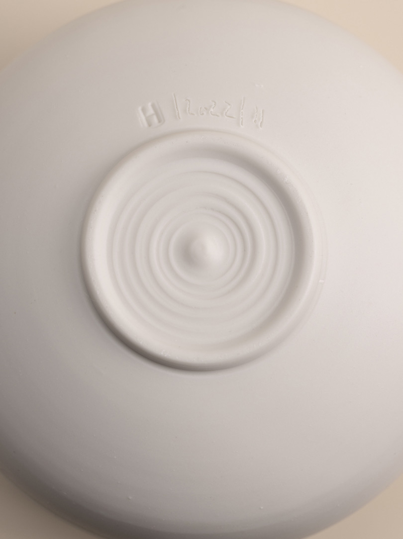 Part of a group of 3 white bowls – small, medium and large. Crafted individually, each piece embodies a unique form and identity, shaped by the artist’s intellectual and physical interaction during its creation. With its minimalist architectural character, this vessel has a presence that gracefully fills the space. Though not immediately visible, the tiny pedestal elevates the bowl, creating an ever-changing interplay of light and shadow around and below it. Despite its delicate appearance, the surface is pleasantly rough to the touch; as your hands glide over the vessel’s curves, a raw sound emerges, reminiscent of nature and unexpectedly soothing. A multi-sensory piece, with the perfect aesthetic dimensions, it promises daily delight, regardless of its intended use.