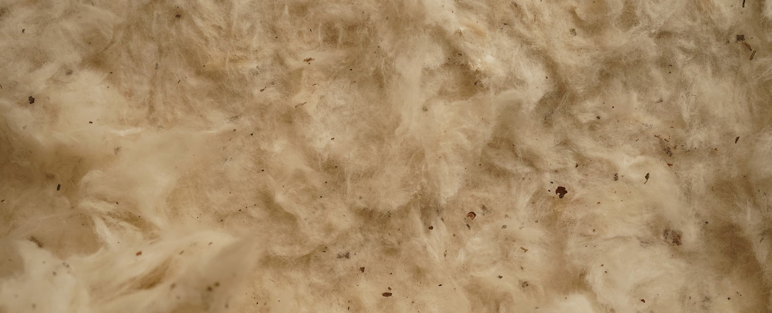 Cotton dust floats like mist, softening the outlines of pipes, beams and machines. A single clock ticks above the doorway, its hands furred with tiny white threads that hang like minuscule stalactites. The remaining floor space is packed with candy floss-like wads of cotton pressed into soft layers that resemble pepper-flecked cream. Niwa-san places down his bale and raps it with his knuckle to show us the hollow sound it makes, before snipping the binding straps. The mass swells and breathes, springing upward as if remembering its natural form. It is scrunchy-soft to the touch.