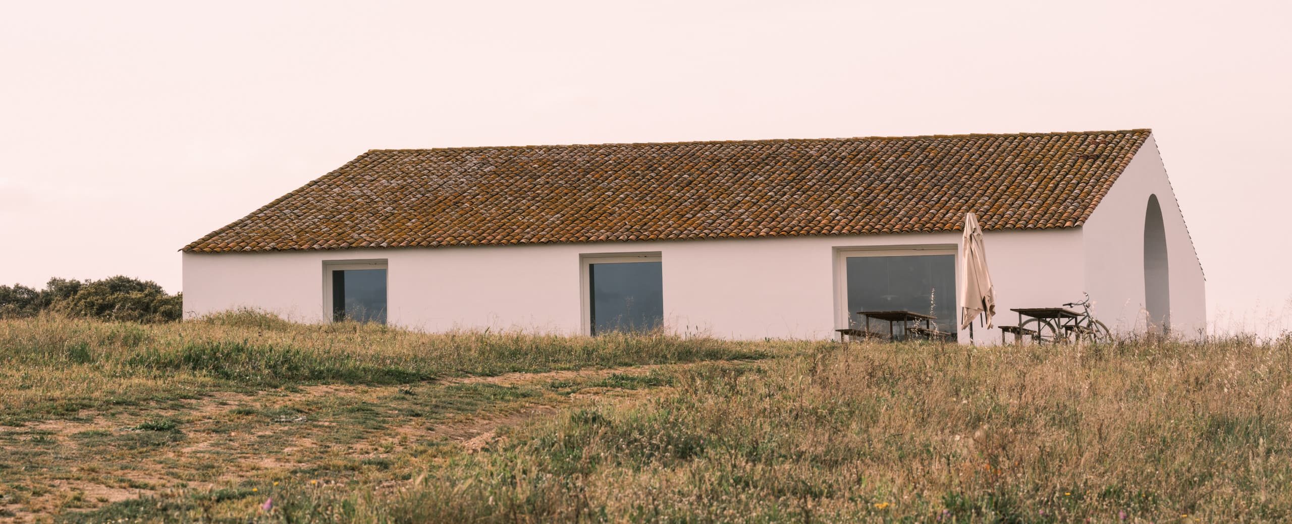 While we are here, we walk on misty grass surrounded by silence. This sort of primordial beauty feels almost mystical. It has been a cool night and the grass crackles softly under the shoes; you cannot feel it and barely hear it, yet it completes the sensorial experience. While the fog slowly lifts up on the lake and the horizon, we watch the horses walk towards the house as the sunlight stretches further. While taking in the atmosphere, we notice that our eyes keep returning to the white one-storey house. It looks almost flat from the distance. A simple structure you cannot get enough of, with its arched entrance and its pointy, slightly asymmetrical roof. Simple lines and shapes that are not naturally part of this environment, yet feel just right in it. João’s words about wanting to create a place where flora, fauna and human life are in perfect balance gains a new meaning at this sight.