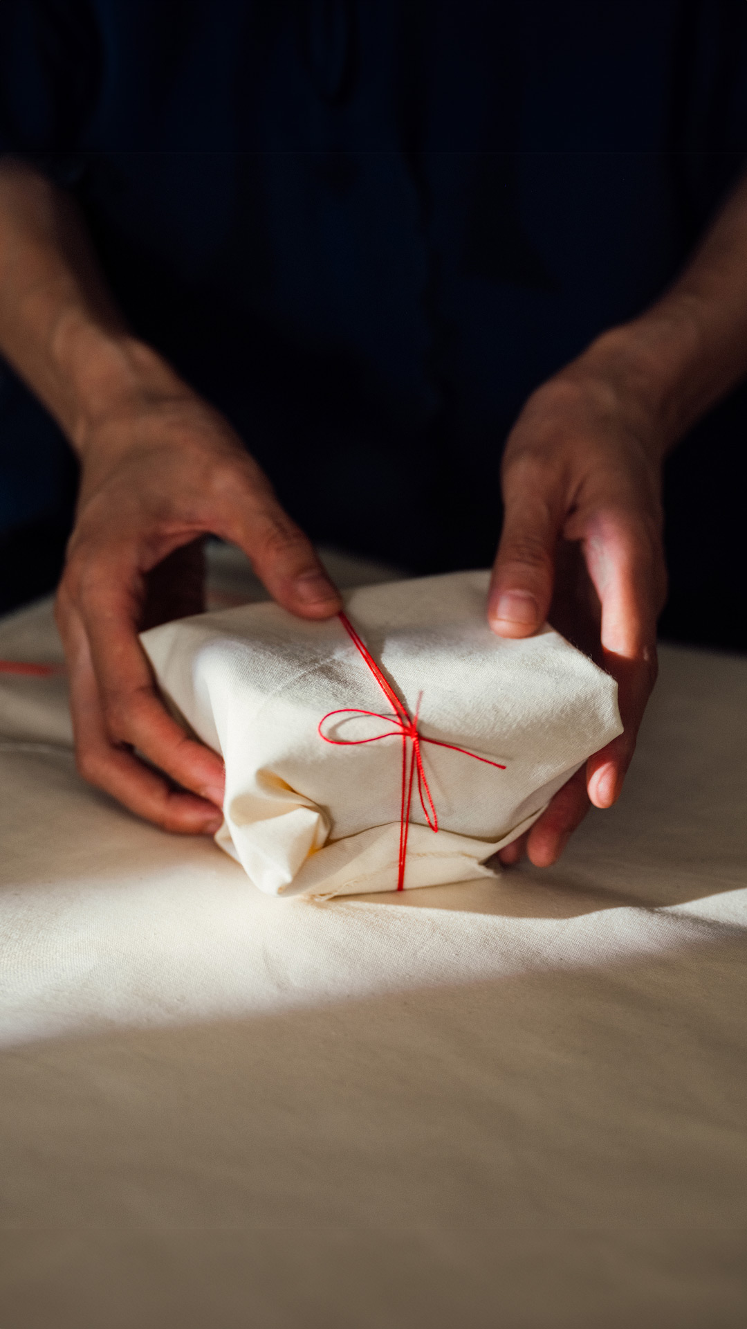 Here’s how to create it yourself: spread out the cloth, printed side down, in a diamond shape, so that one corner is pointing at you. Place the object you wish to wrap in the centre. Then fold the bottom corner over the object towards the top, and tuck it slightly underneath. Fold the top corner down over the object. Finally, take the left and right corners, bring them together over the top, and tie a square knot (right over left, then left over right), gently tightening it to finish.