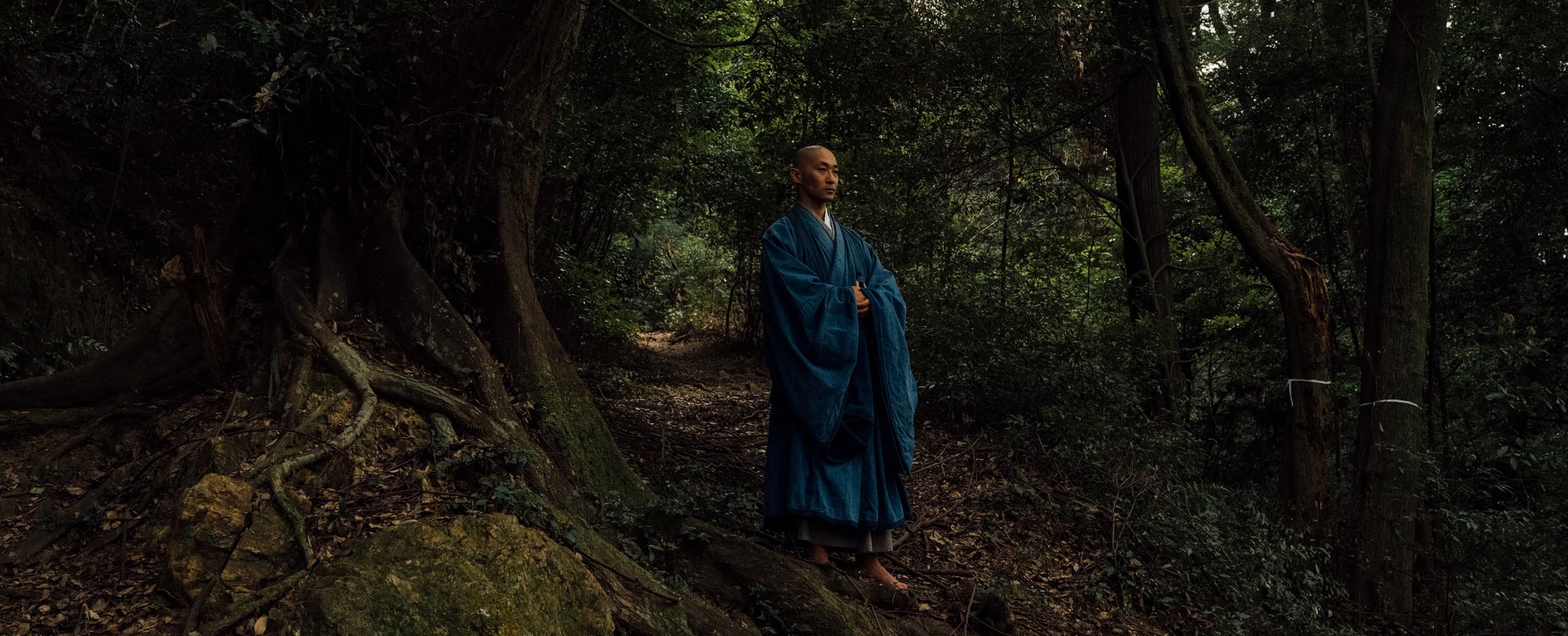 Tosei’s warm demeanour and chiselled cheekbones lend his features an ageless clarity. Seated cross-legged on the tatami, wrapped in deep blue linen ceremonial robes, he has his hands resting lightly in his lap. His gaze holds a steady alertness. We lock into it as he guides us into the practice for which we are here today to experience.