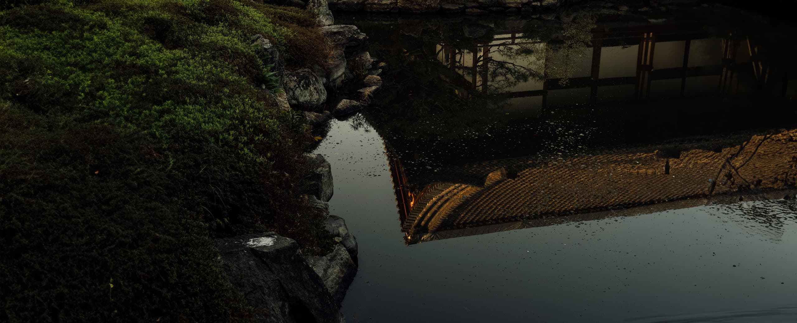 At 5am, the air is crisp. We walk the diamond-shaped stone paths of the forecourt garden, an ethereal landscape of white gravel and carefully raked patterns, pockets of soft moss, weathered stone basins, and a scattering of deep green trees.