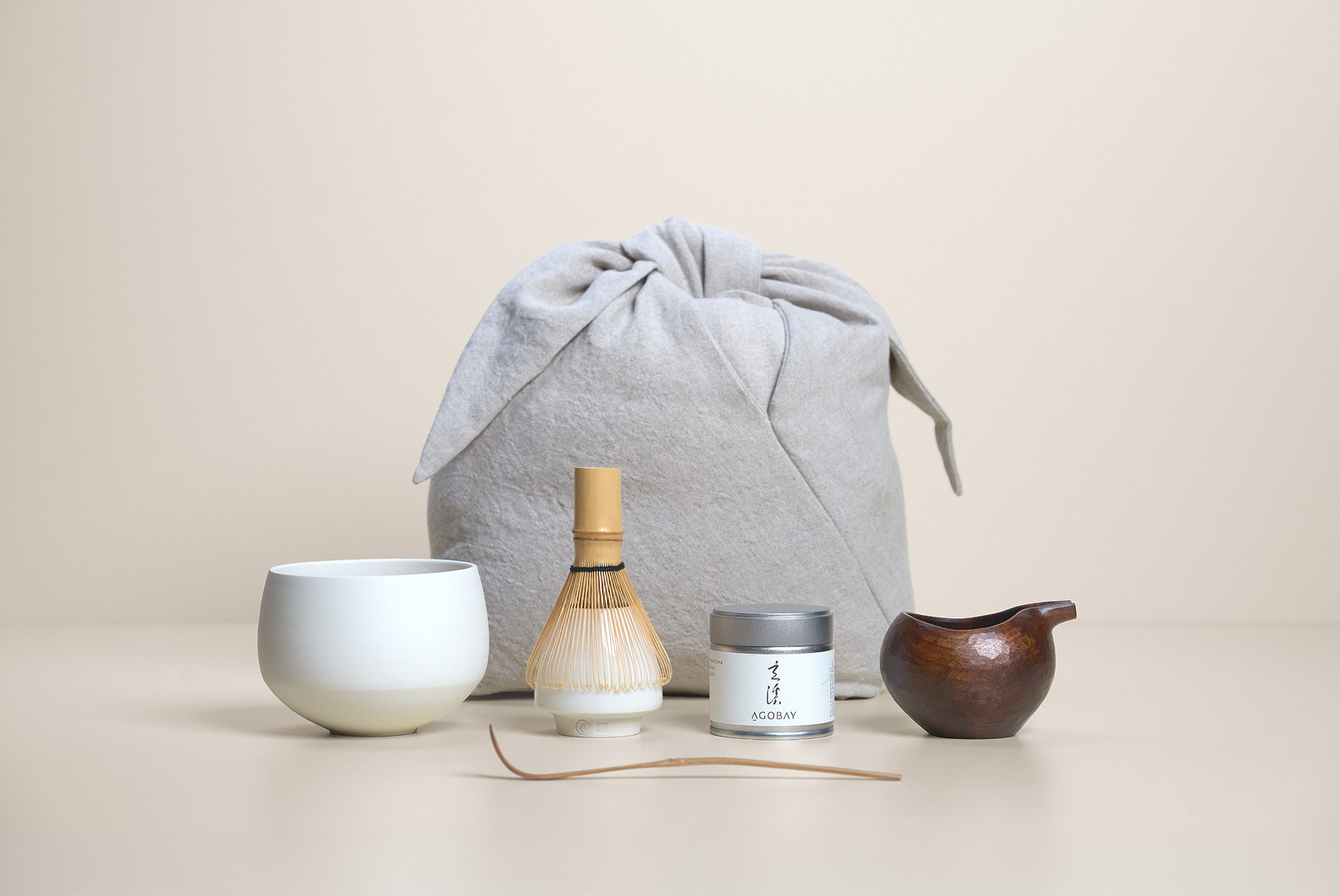 Dedicated to matcha, our travel bag set is a powerhouse collaboration between many of our artisans, bringing together everything you need for an elevated daily ritual – wherever you are – held in a custom-made padded linen bag. It includes a porcelain matcha bowl, walnut water pitcher, bamboo whisk and spoon, a whisk holder and our AGOBAY Kyoto matcha tea.