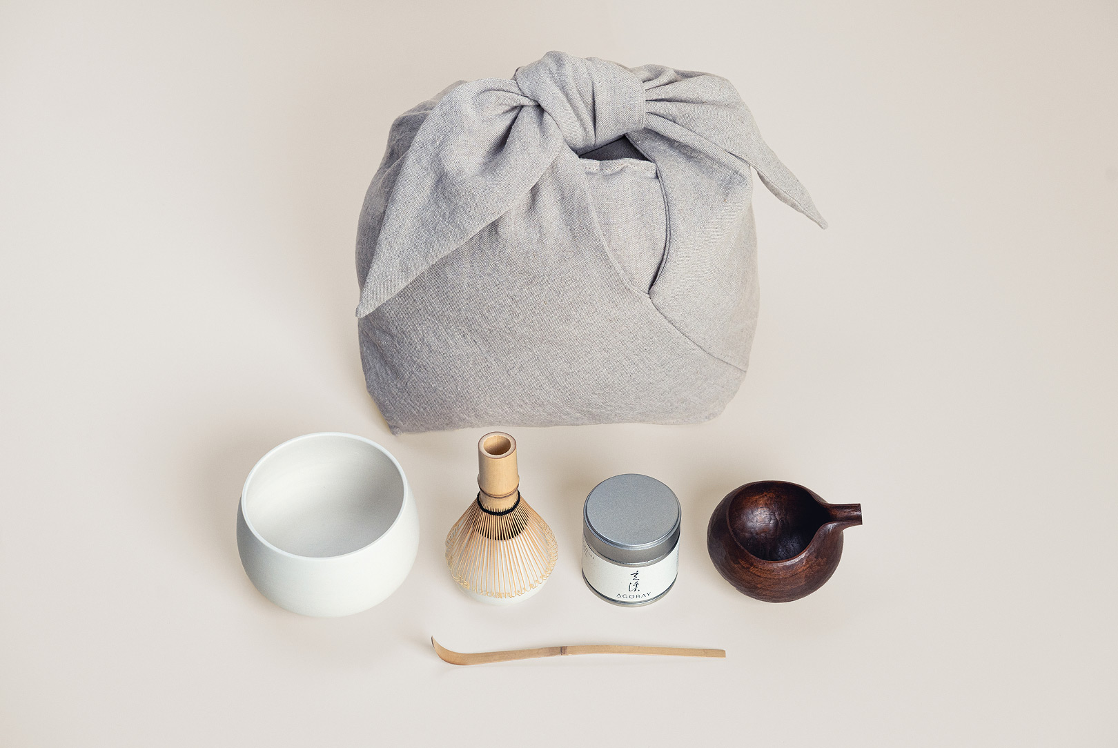 Bag: linen, cotton Bowl: unglazed porcelain Whisk holder: glazed porcelain Water pitcher: walnut Whisk and spoon: bamboo Tea: Kyoto Uji Matcha