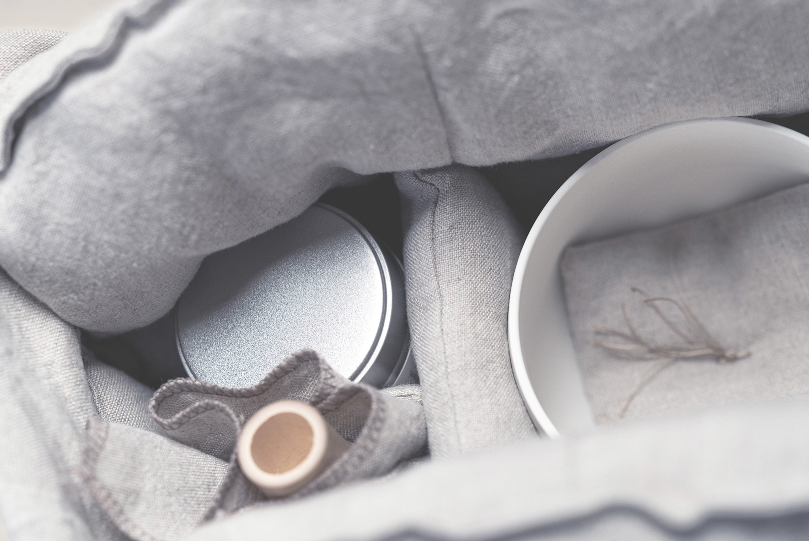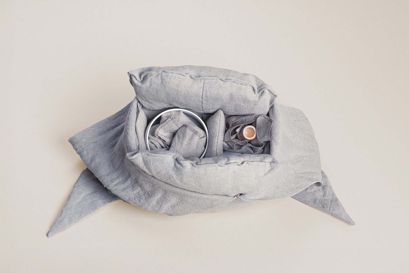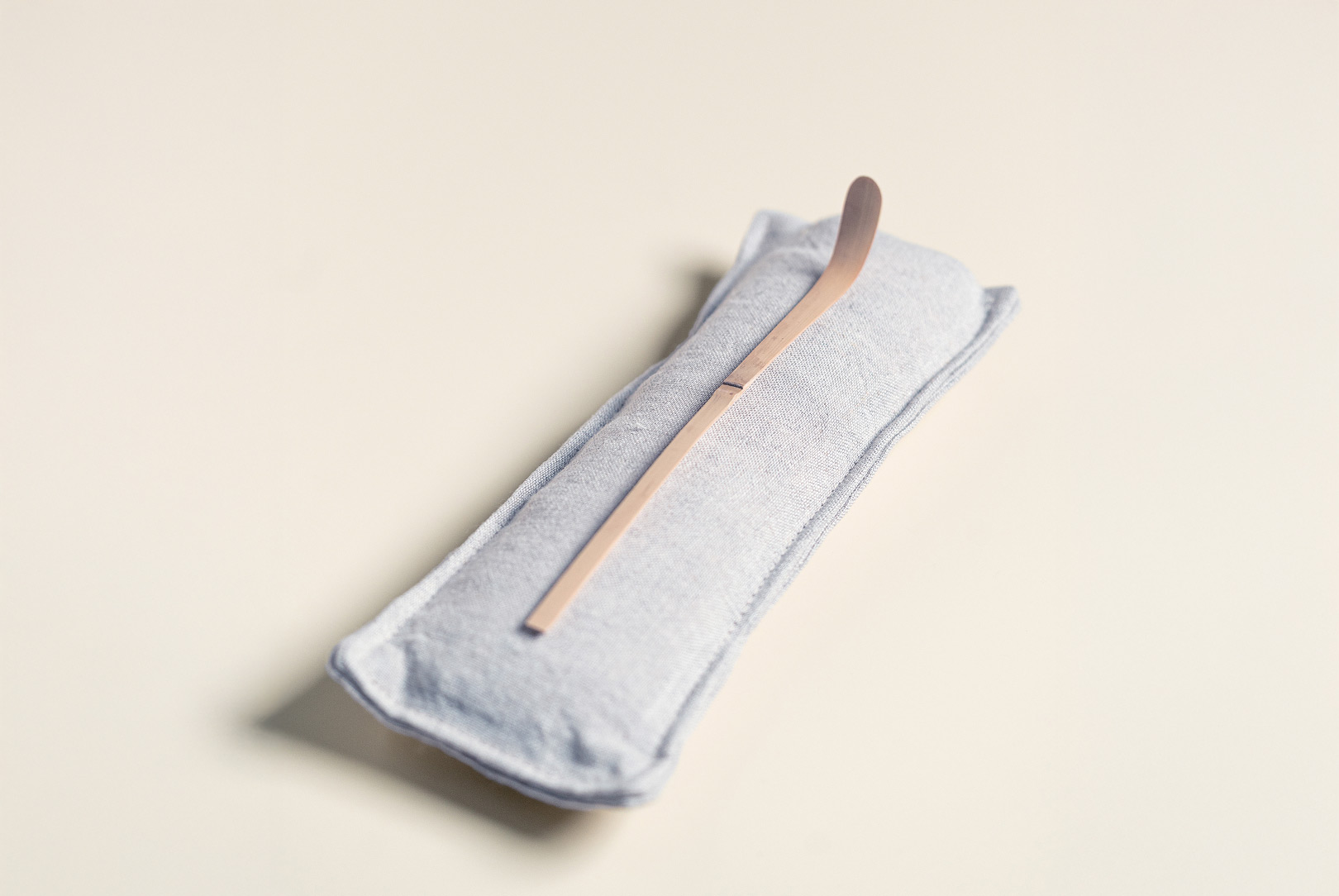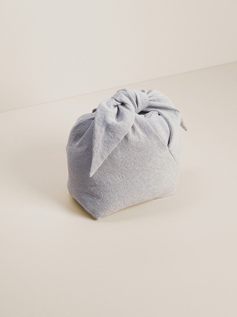 AGOBAY Showroom ZurichOur bag design draws inspiration from the traditional ‘azuma bukuro’, or Japanese wrapping bag. Developed through repeated refinements in collaboration with Shinya Sakurai of the Sakurai Japanese Tea Experience Laboratory, its graceful form achieves a balanced shape that cradles the tea utensils perfectly. The beige linen fabric is a thick weave, chosen for its sturdy texture, with fibres that were carefully brushed by hand before being woven to offer a pleasant touch and refined presence by Nagoya-based Niwa Futon.