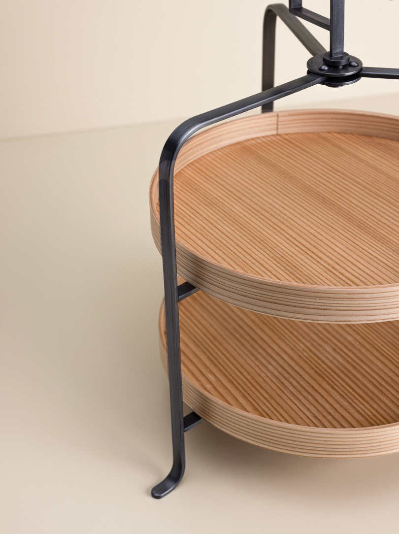 A minimalist and elegant copper legged afternoon tea stand with two wooden trays. This OGATA design is crafted in Tsubane, in the Niigata Prefecture and Hirosaki, in the Aomori Prefecture.