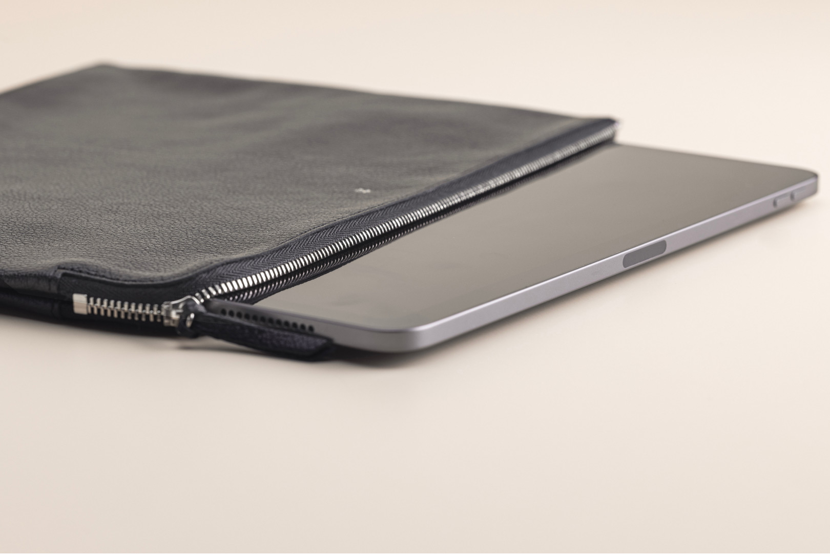 Elegantly minimalist and remarkably versatile, this pouch serves a multitude of purposes. This large case comfortably accommodates an iPad or a tablet up to 11 inches, while the cleverly designed L-shaped zipper ensures effortless access. Its true luxury lies in its double-leather lining: impeccably crafted, subtle to the touch and yet imbued with a robustness that transforms it into the ideal lifelong companion.