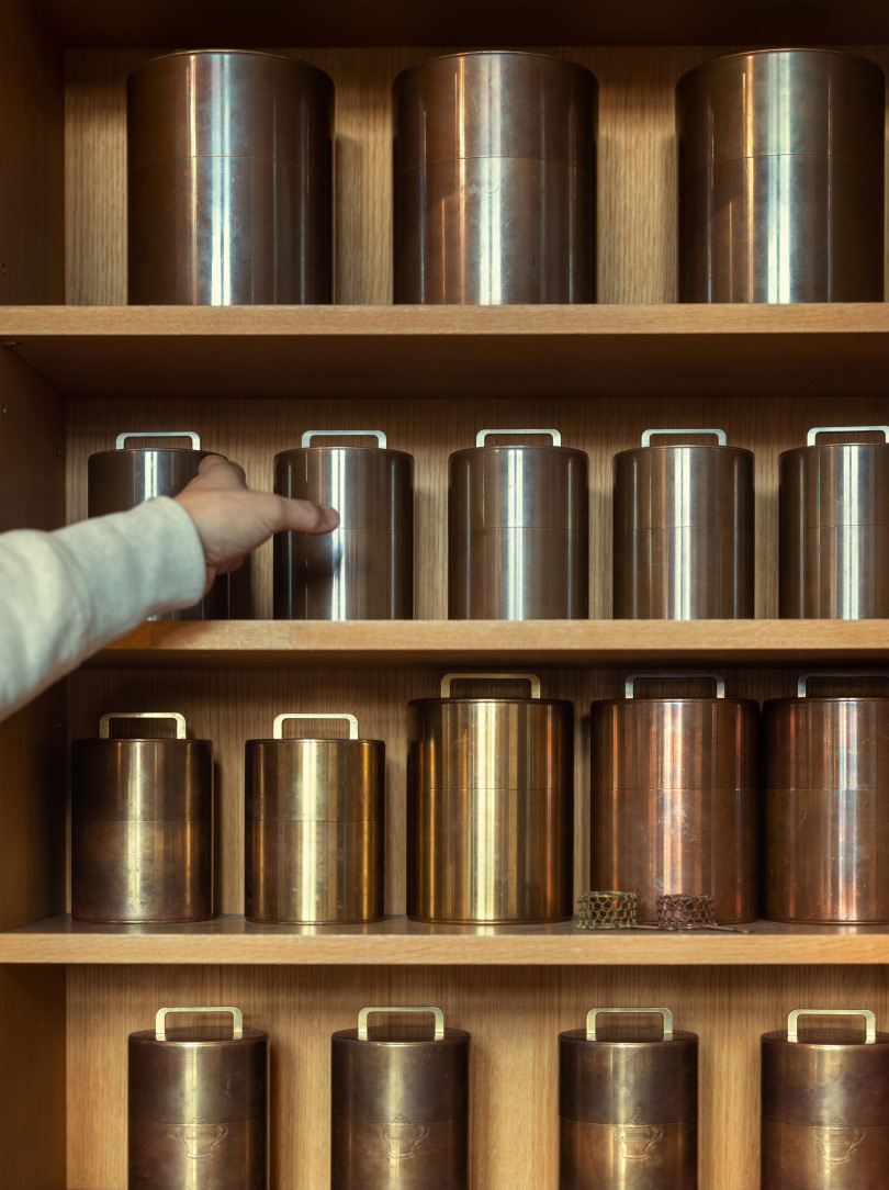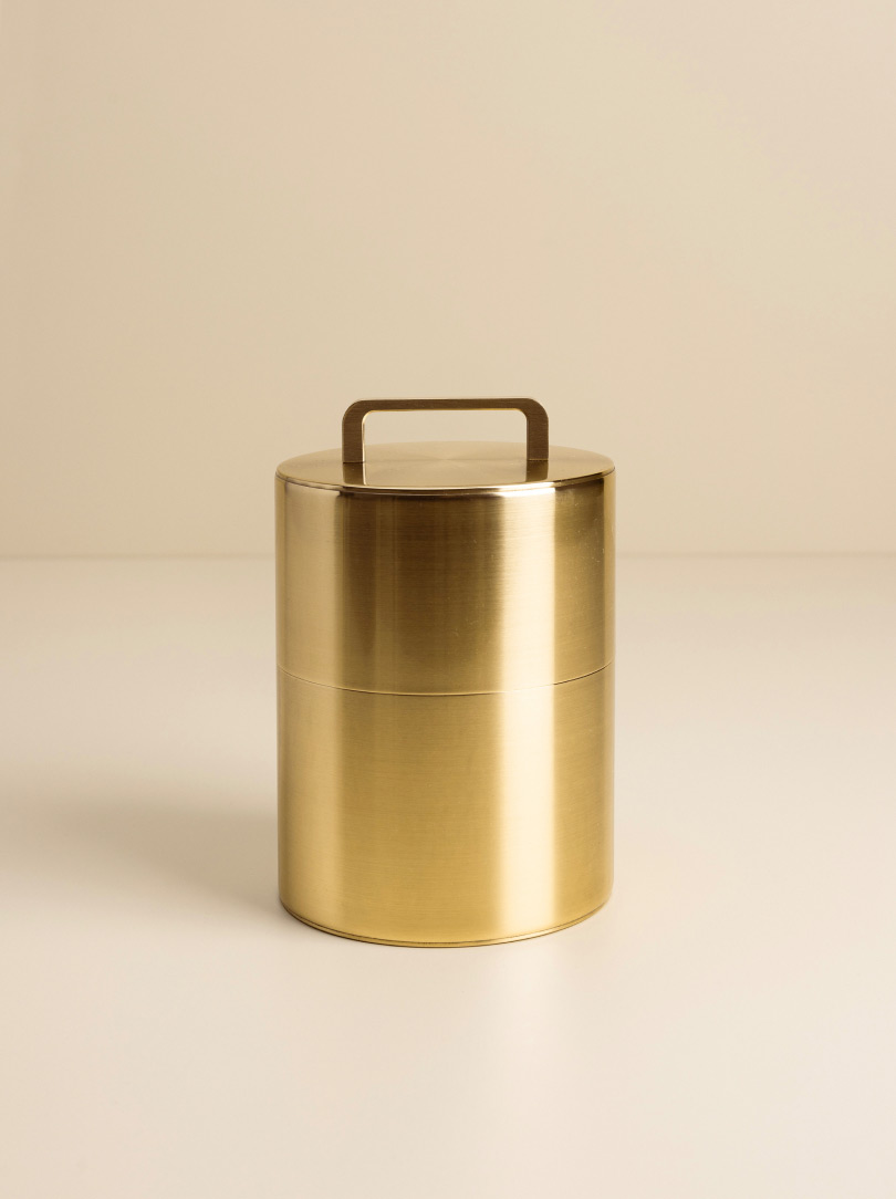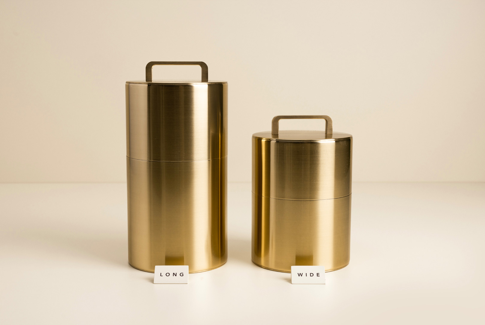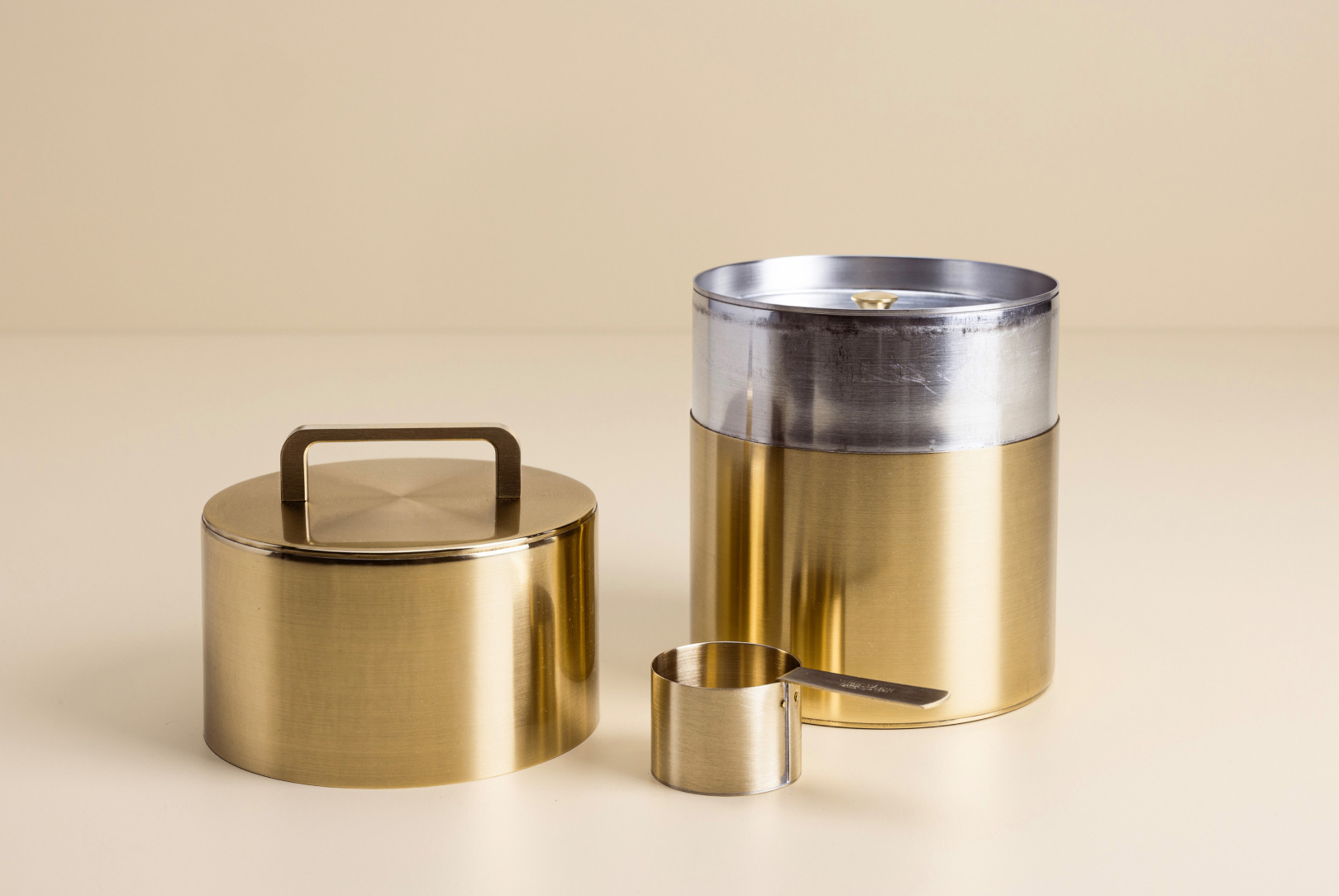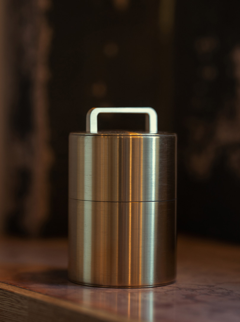 AGOBAY Showroom ZurichEach coffee caddy comes with a brass scoop and is made entirely by hand with the utmost care and precision; in fact, the friction-fit lid closes by itself, without any pressure. Just line up the visible seams on both parts and observe the lid descend onto the caddy's body on its own. Slowly and gently, you will be able to hear the faint sound of air smoothly being expelled by the caddy, so you know it is becoming airtight. Height 160 mm, diameter 110 mm.