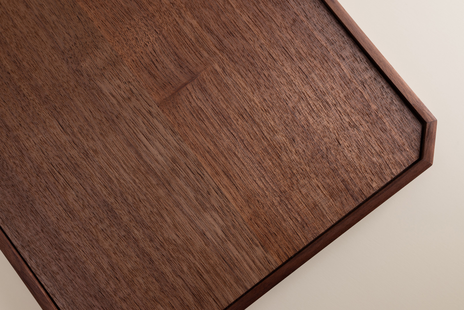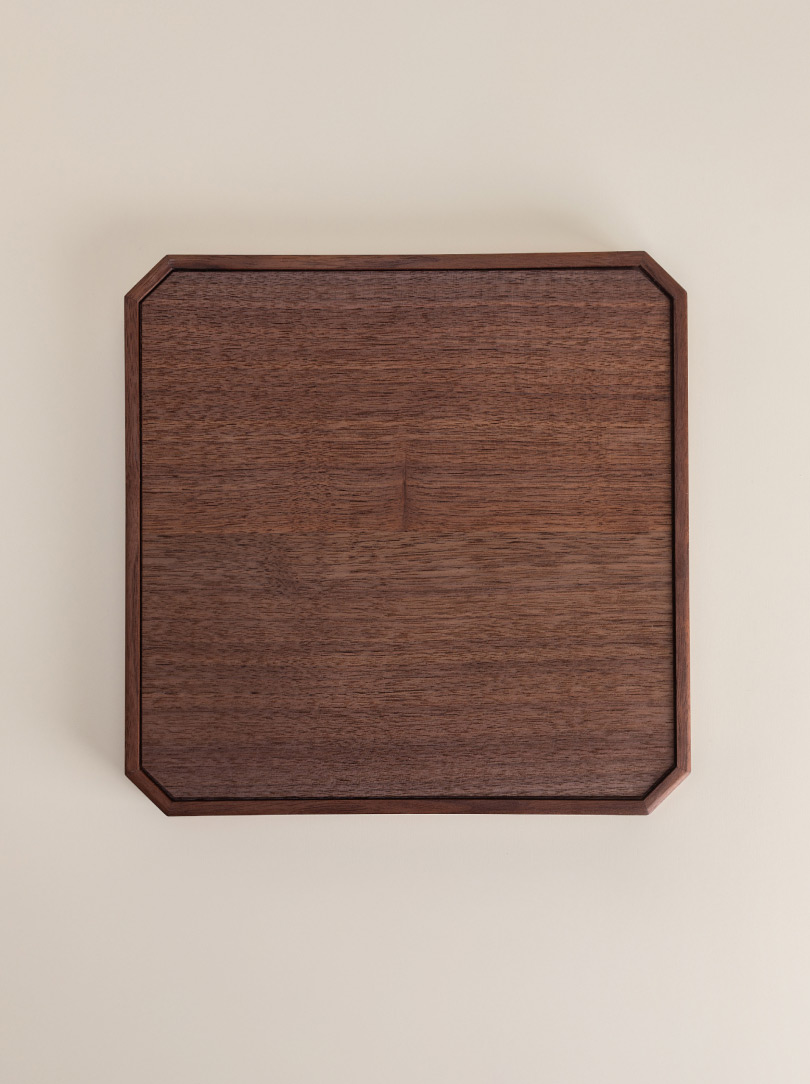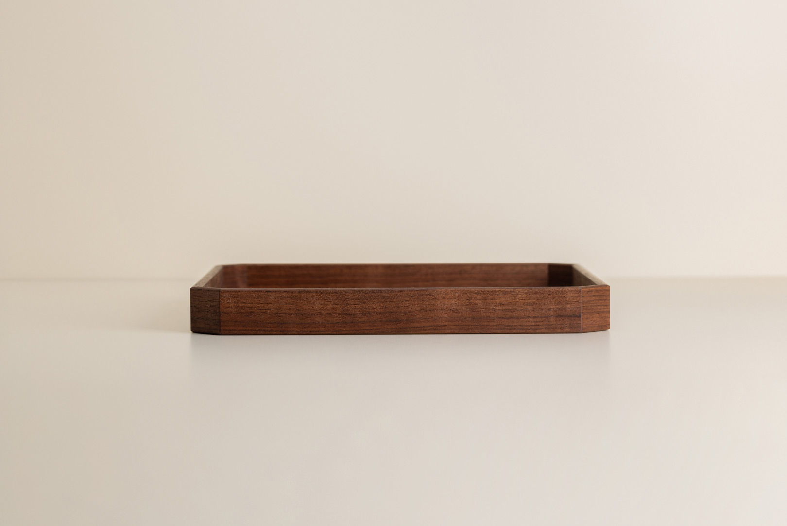 Handcrafted from dark walnut wood, this tray – with its refined cut corners, raised edge and warm, organic feel – is a testament to exceptional craftsmanship. Ideal for serving drinks, small bites or organising everyday items, it is a versatile addition to any home, beautifully balancing simplicity with sophistication.