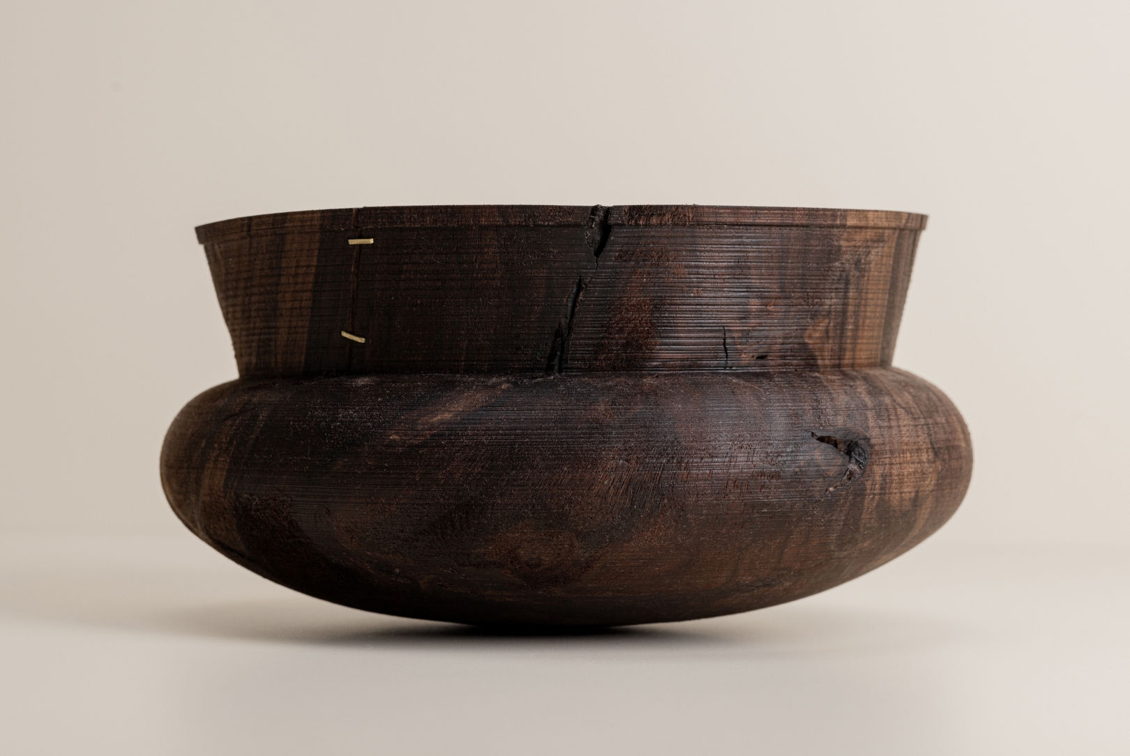 This bowl crafted from exquisite black walnut is a true testament to the art of woodworking. Its unassuming elegance is adorned with intricately carved lines, showcasing the marriage of simplicity and meticulous craftsmanship. This remarkable AGOBAY exclusive features brass ties that adds a touch of luminosity to the otherwise understated and quiet presence of this piece.