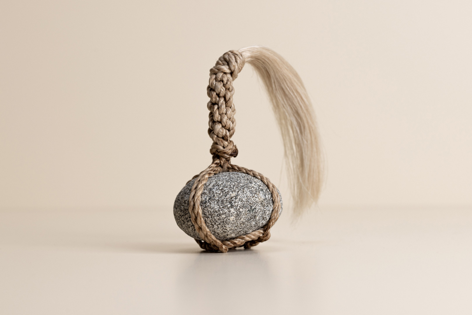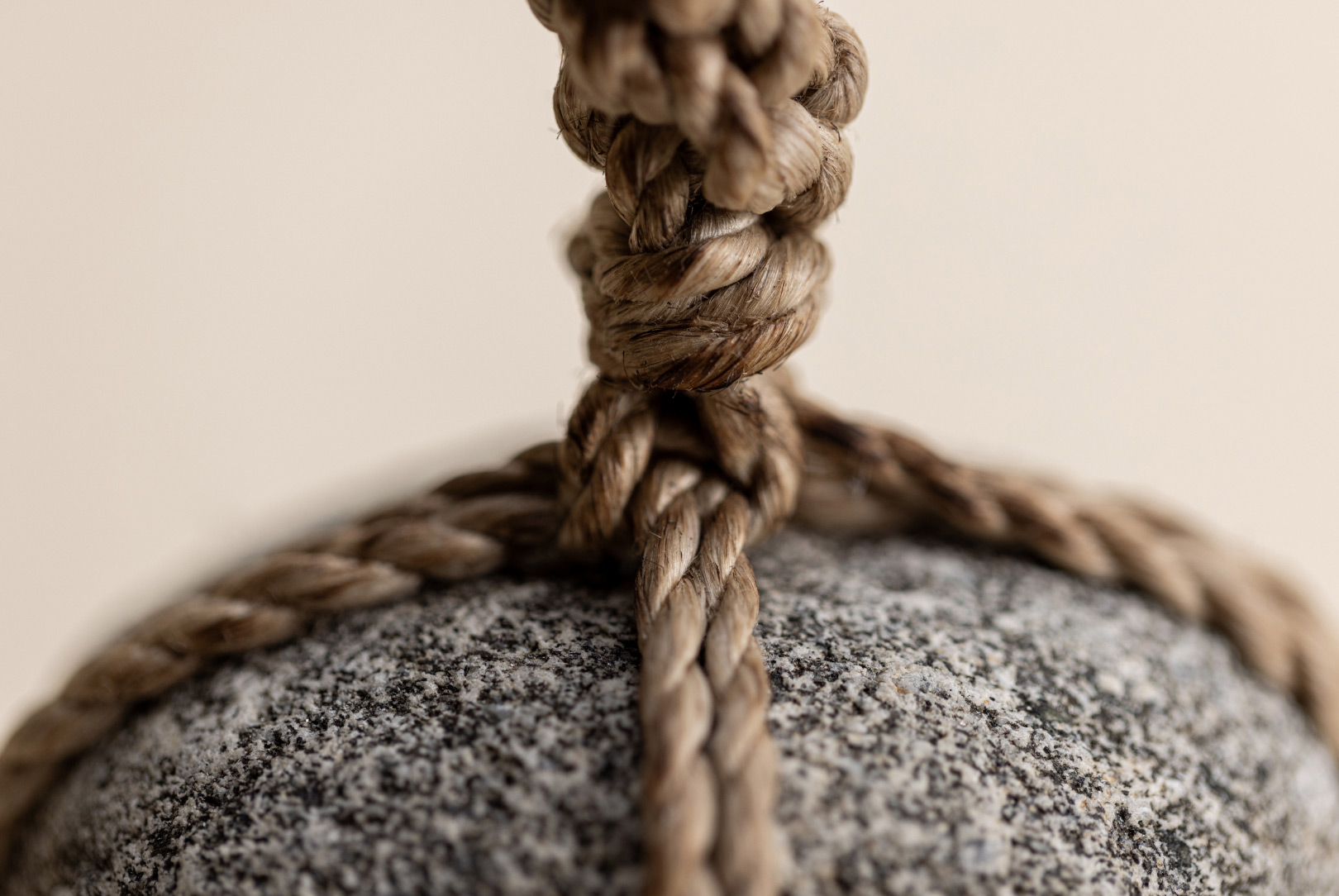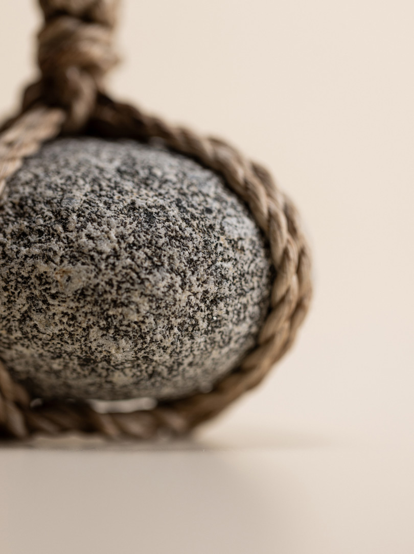 AGOBAY Showroom ZurichOften used in Japanese temples and tea houses, kekkai stones are crafted with intention. They are not merely objects but keepers of spiritual wisdom, echoing the Zen philosophy that ‘heaven, earth and I all share the same origin, and are therefore one’. In Japan, this has led to a spirit of respect for nature and a desire to live in harmony with it since ancient times. The tactile roughness of the stone and the smooth strength of the hemp invite one to ponder the interconnectedness of our existence with nature.