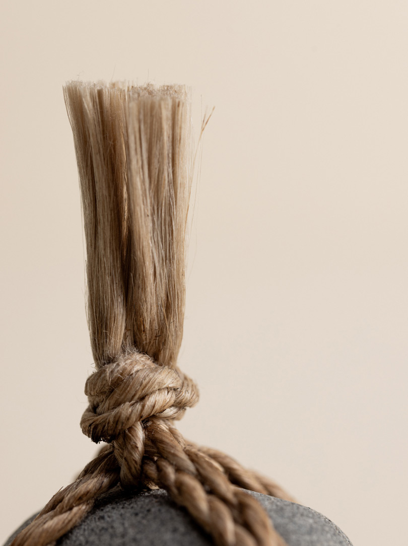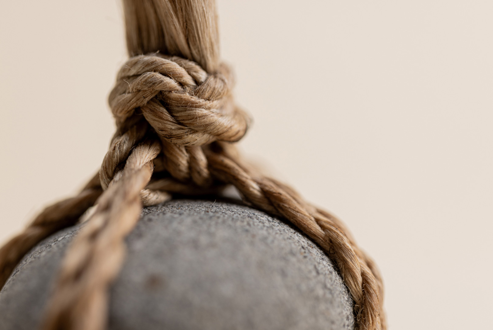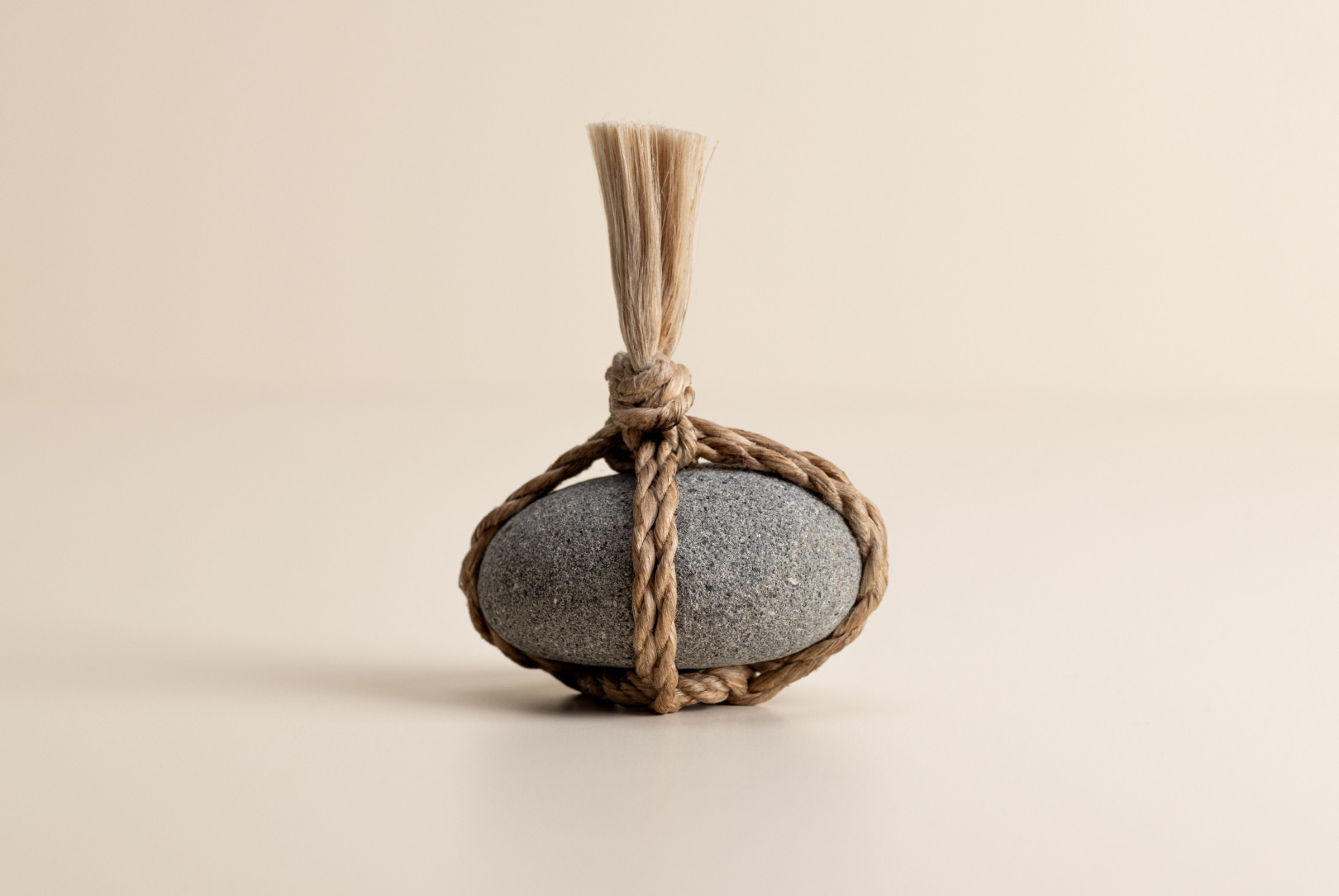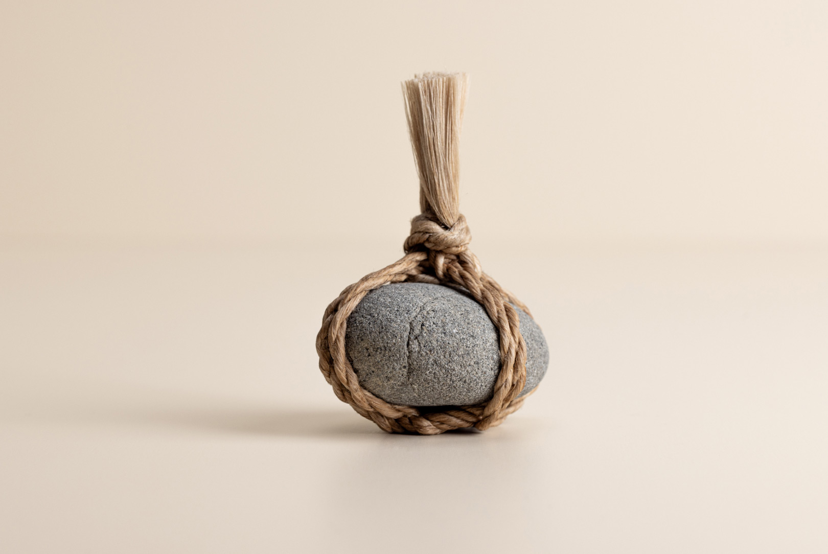AGOBAY Showroom ZurichOften used in Japanese temples and tea houses, kekkai stones are crafted with intention. They are not merely objects but keepers of spiritual wisdom, echoing the Zen philosophy that ‘heaven, earth and I all share the same origin, and are therefore one’. In Japan, this has led to a spirit of respect for nature and a desire to live in harmony with it since ancient times. The tactile roughness of the stone and the smooth strength of the hemp invite one to ponder the interconnectedness of our existence with nature.