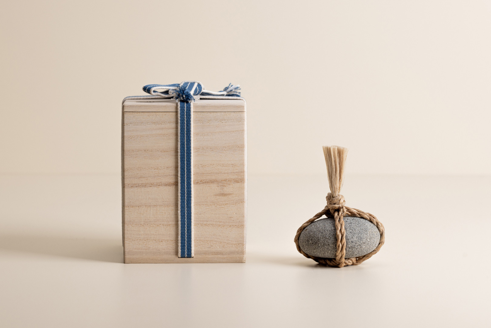 Each stone is delicately wrapped in washi paper, a traditional Japanese paper crafted from the elongated inner fibres of three plants: kozo, mitsumata and gampi. It is presented in a wooden box bearing the artisan’s signature mark. The box itself is made of Paulownia wood, known in East Asia as the ‘empress tree’ and valued for its lightweight but strong properties.