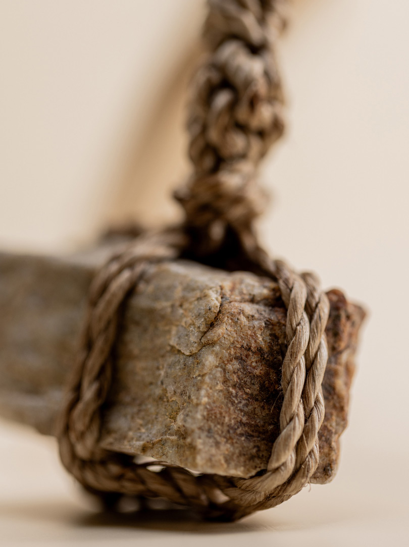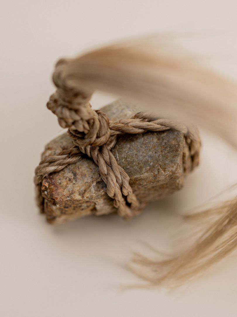 AGOBAY Showroom ZurichOften used in Japanese temples and tea houses, kekkai stones are crafted with intention. They are not merely objects but keepers of spiritual wisdom, echoing the Zen philosophy that ‘heaven, earth and I all share the same origin, and are therefore one’. In Japan, this has led to a spirit of respect for nature and a desire to live in harmony with it since ancient times. The tactile roughness of the stone and the smooth strength of the hemp invite one to ponder the interconnectedness of our existence with nature.
