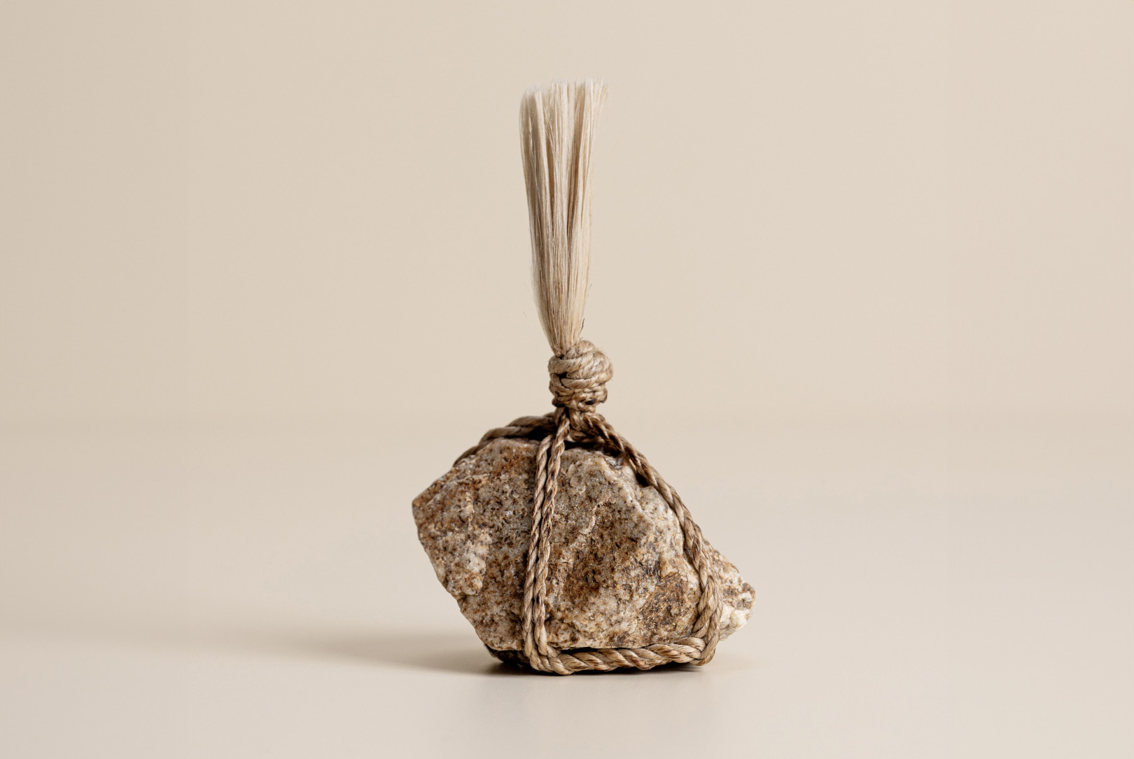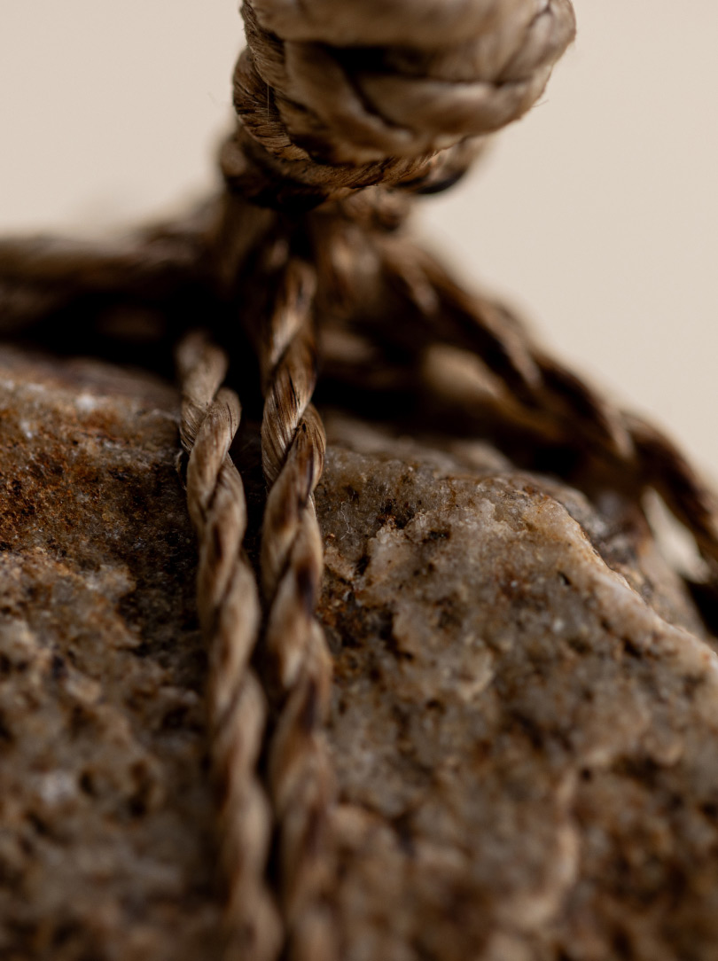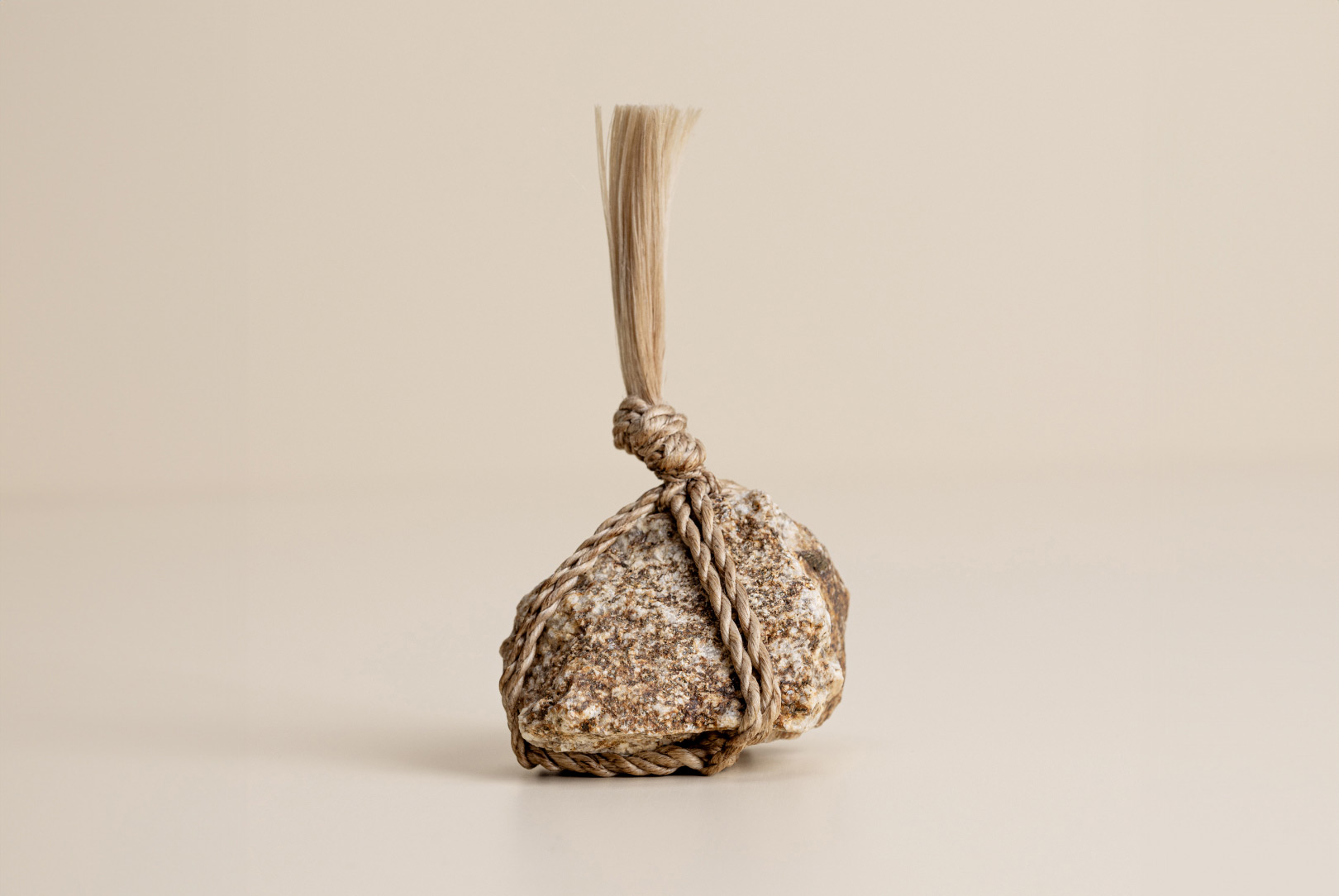 AGOBAY Showroom ZurichOften used in Japanese temples and tea houses, kekkai stones are crafted with intention. They are not merely objects but keepers of spiritual wisdom, echoing the Zen philosophy that ‘heaven, earth and I all share the same origin, and are therefore one’. In Japan, this has led to a spirit of respect for nature and a desire to live in harmony with it since ancient times. The tactile roughness of the stone and the smooth strength of the hemp invite one to ponder the interconnectedness of our existence with nature.