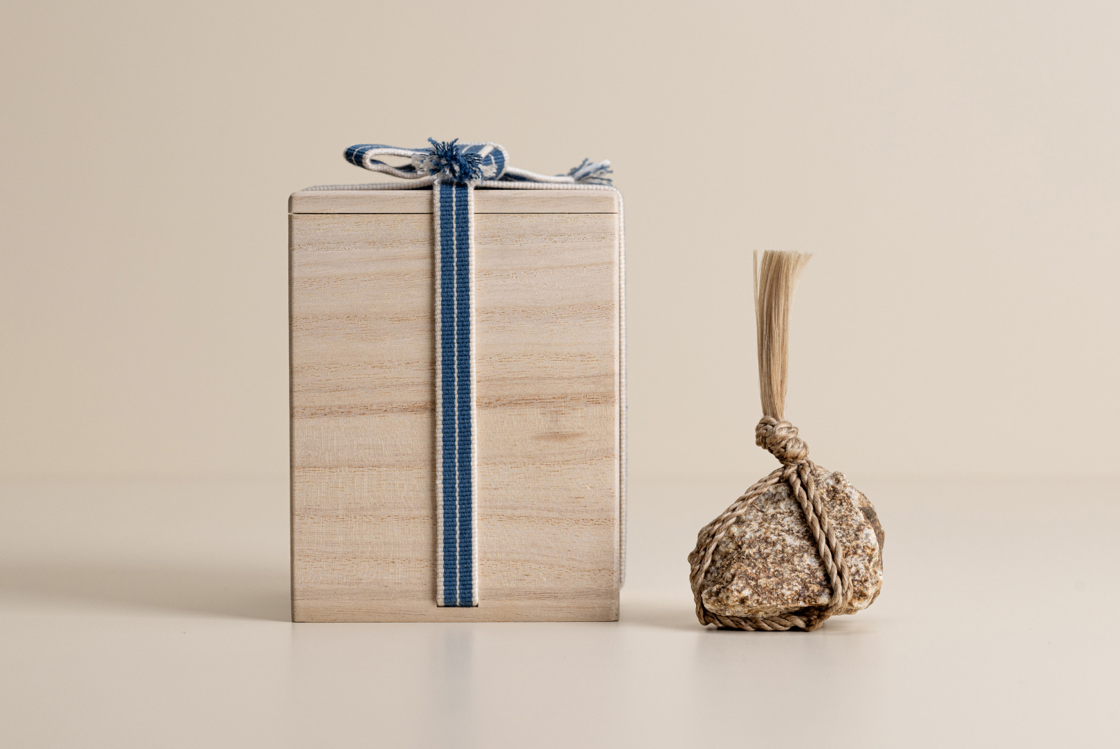 Each stone is delicately wrapped in washi paper, a traditional Japanese paper crafted from the elongated inner fibres of three plants: kozo, mitsumata and gampi. It is presented in a wooden box bearing the artisan’s signature mark. The box itself is made of Paulownia wood, known in East Asia as the ‘empress tree’ and valued for its lightweight but strong properties.
