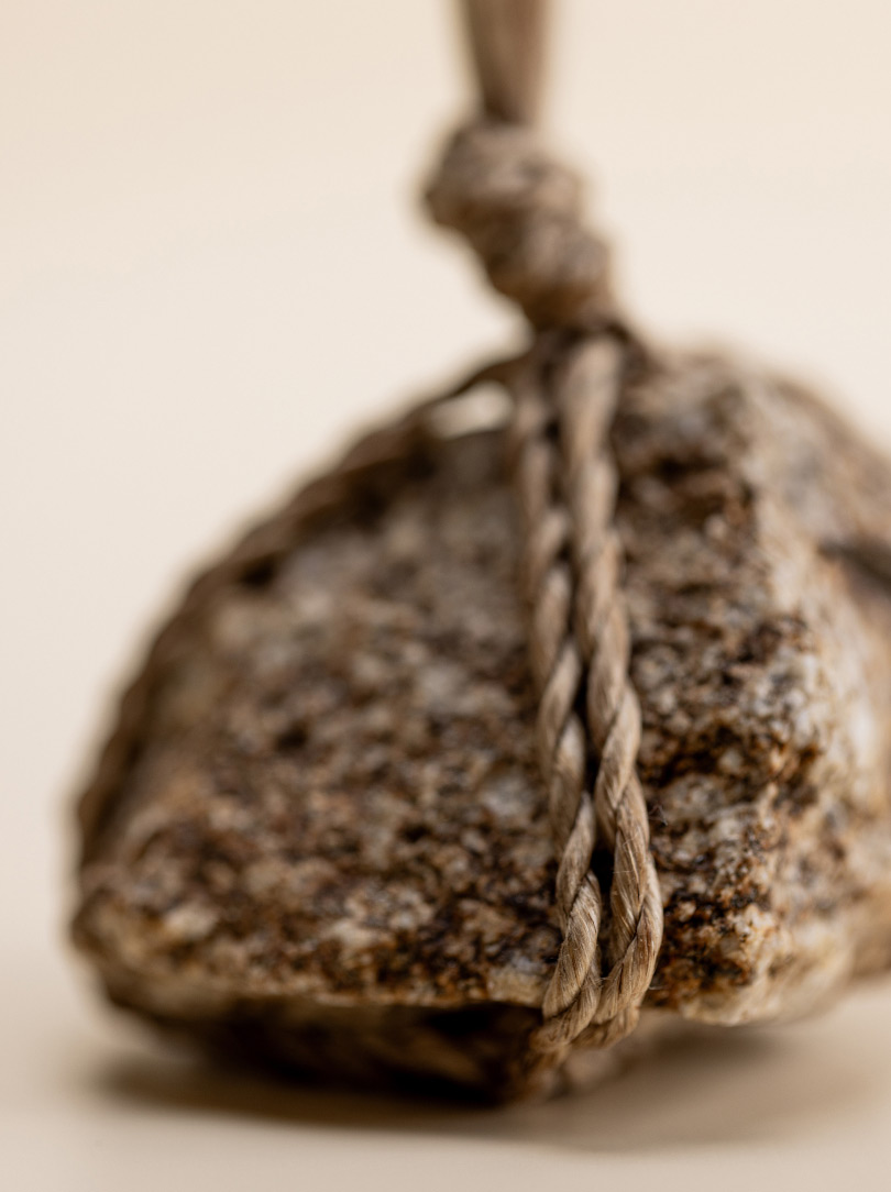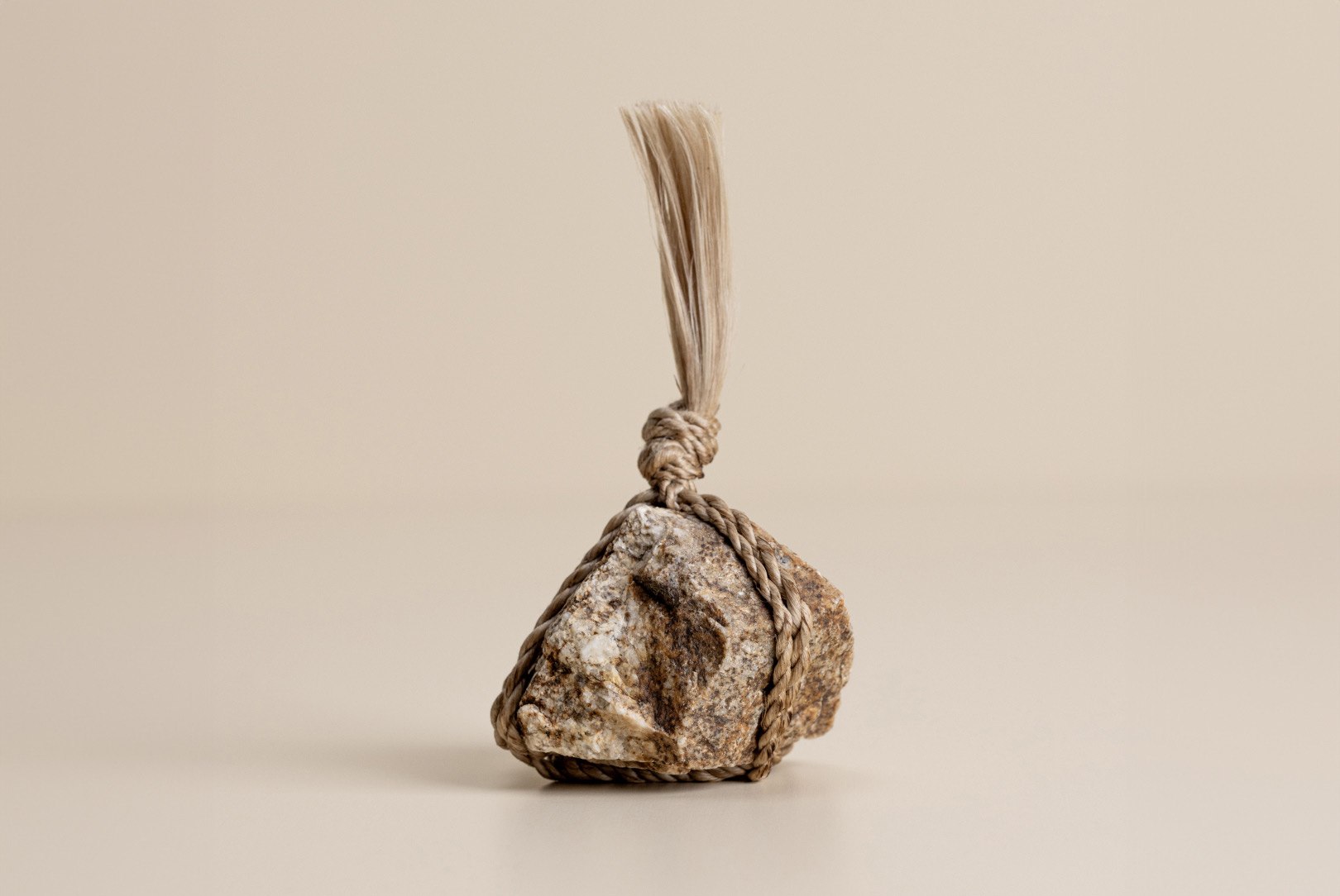 In the quietness of the dawn at one of Kyoto’s oldest Zen temples, Buddhist Zen monk Tosei Shinabe sits in deep meditation, practising ‘zazen’ (‘za’ 坐, Japanese for seated and ‘zen’ 禅 for meditation). His journey takes him to the mystical Awaji Island, the ‘land of birth’ in Japanese mythology, where he selects stones imbued with the earth’s raw beauty. Wrapped in Seima rope made from the finest Japanese hemp, his za kekkai stones serve as a silent testament, a Dharma tool, to the boundary between two spiritual realms, a line as delicate as it is profound.