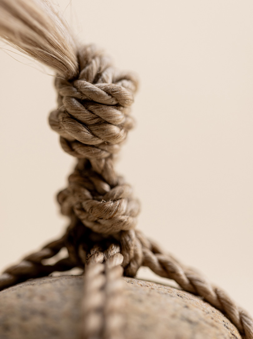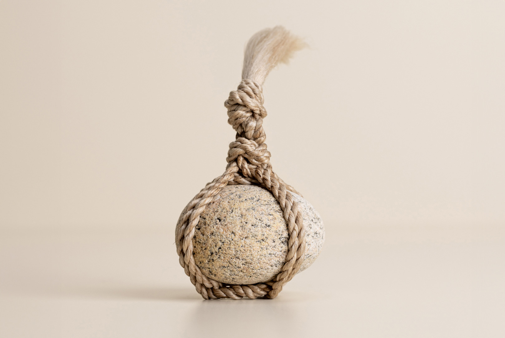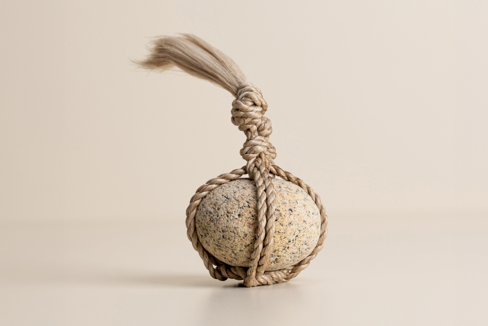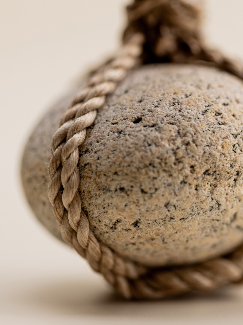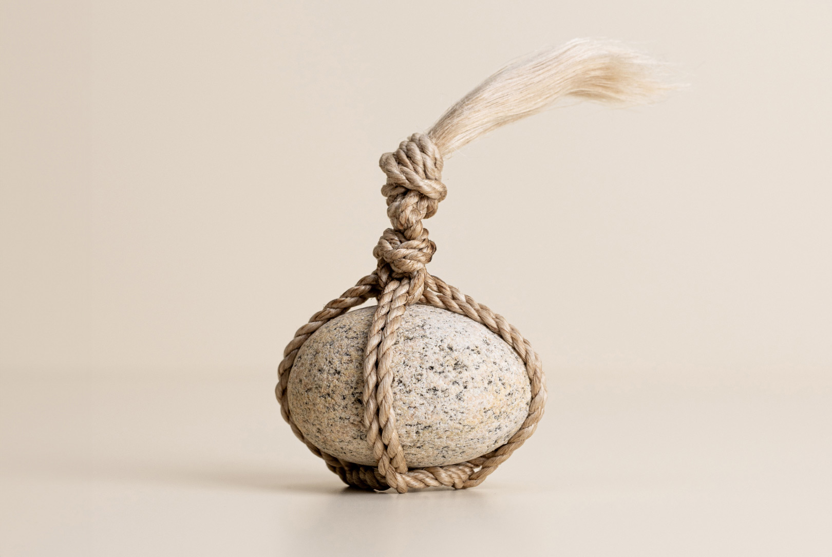 AGOBAY Showroom ZurichOften used in Japanese temples and tea houses, kekkai stones are crafted with intention. They are not merely objects but keepers of spiritual wisdom, echoing the Zen philosophy that ‘heaven, earth and I all share the same origin, and are therefore one’. In Japan, this has led to a spirit of respect for nature and a desire to live in harmony with it since ancient times. The tactile roughness of the stone and the smooth strength of the hemp invite one to ponder the interconnectedness of our existence with nature.