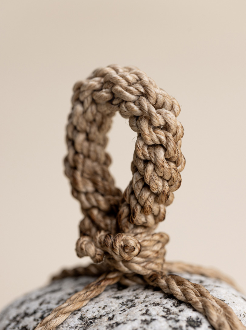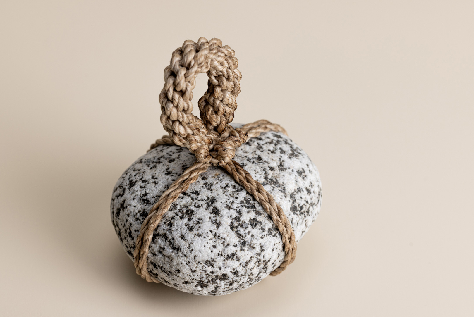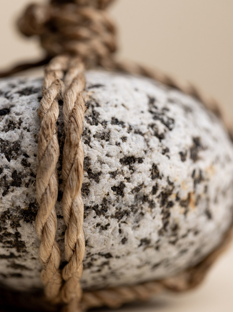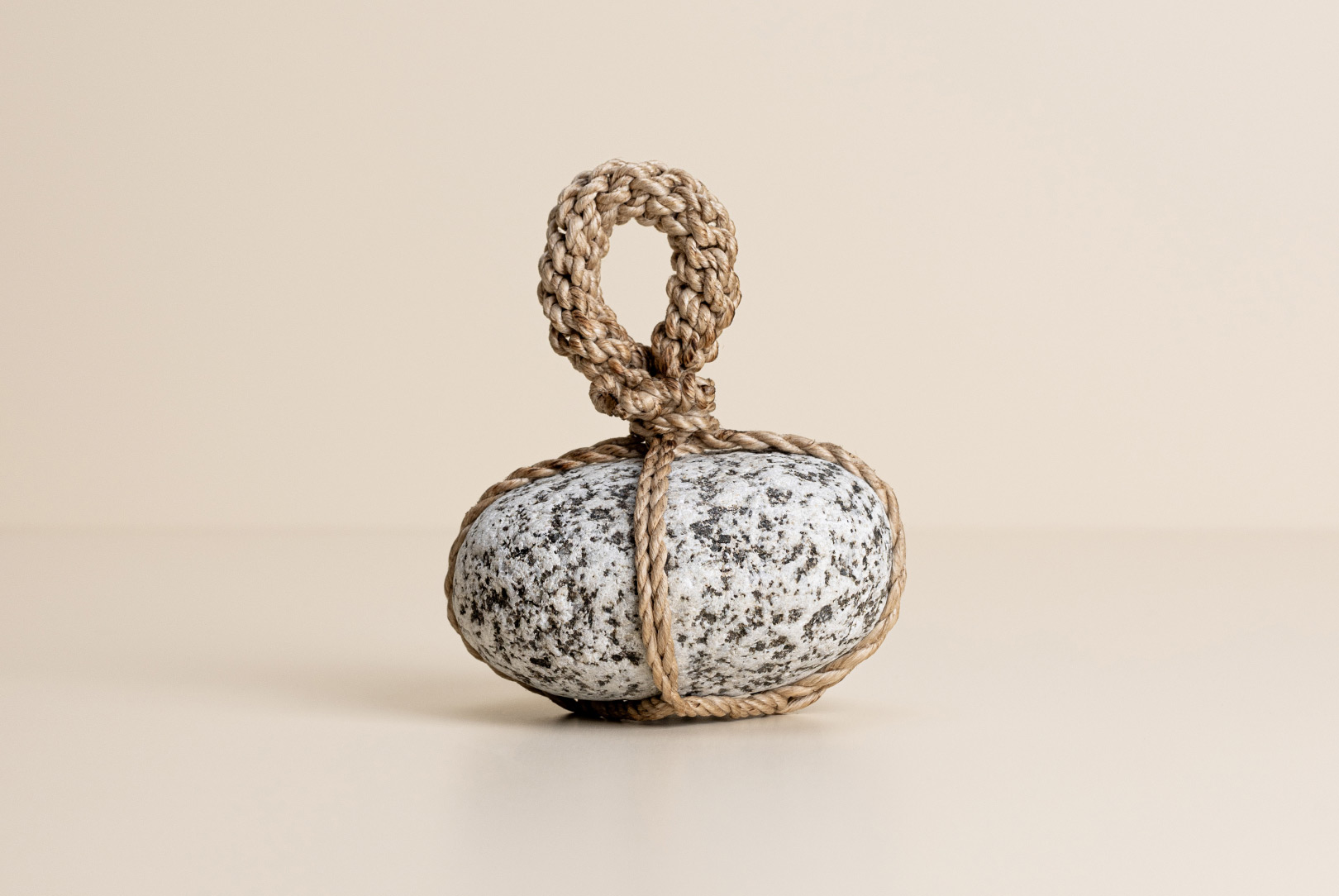 AGOBAY Showroom ZurichOften used in Japanese temples and tea houses, kekkai stones are crafted with intention. They are not merely objects but keepers of spiritual wisdom, echoing the Zen philosophy that ‘heaven, earth and I all share the same origin, and are therefore one’. In Japan, this has led to a spirit of respect for nature and a desire to live in harmony with it since ancient times. The tactile roughness of the stone and the smooth strength of the hemp invite one to ponder the interconnectedness of our existence with nature.