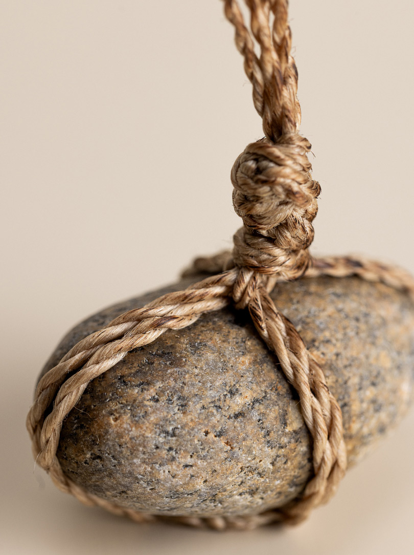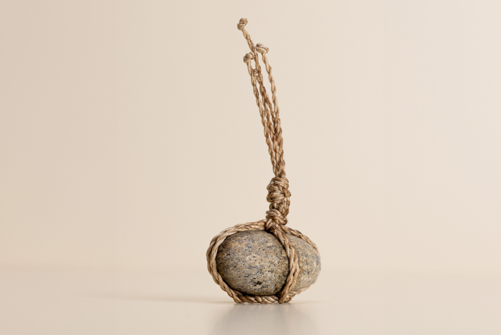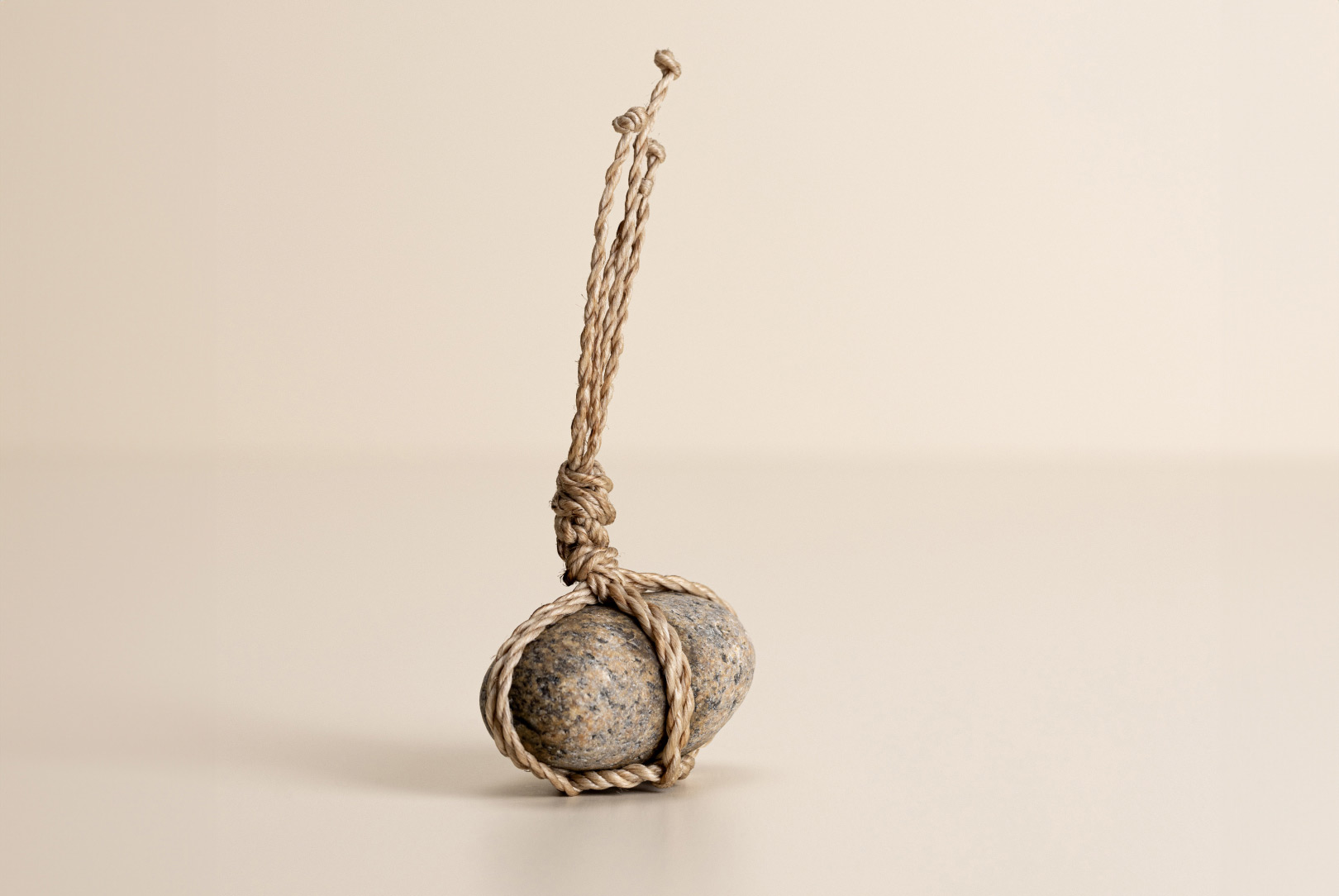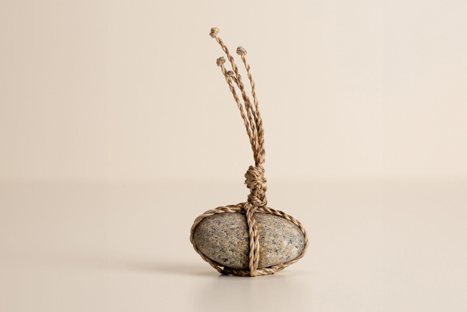 AGOBAY Showroom ZurichOften used in Japanese temples and tea houses, kekkai stones are crafted with intention. They are not merely objects but keepers of spiritual wisdom, echoing the Zen philosophy that ‘heaven, earth and I all share the same origin, and are therefore one’. In Japan, this has led to a spirit of respect for nature and a desire to live in harmony with it since ancient times. The tactile roughness of the stone and the smooth strength of the hemp invite one to ponder the interconnectedness of our existence with nature.