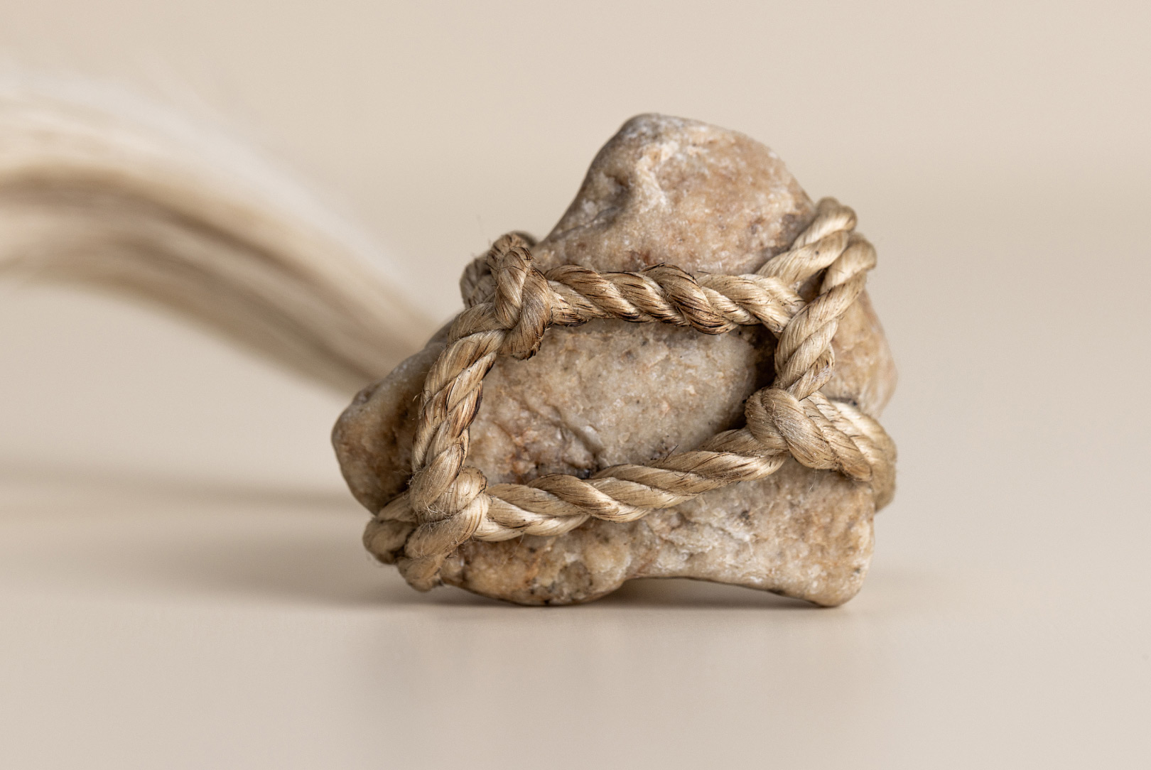 In the quietness of the dawn at one of Kyoto’s oldest Zen temples, Buddhist Zen monk Tosei Shinabe sits in deep meditation, practising ‘zazen’ (‘za’ 坐, Japanese for seated and ‘zen’ 禅 for meditation). His journey takes him to the mystical Awaji Island, the ‘land of birth’ in Japanese mythology, where he selects stones imbued with the earth‘s raw beauty. Wrapped in Seima rope made from the finest Japanese hemp, his za kekkai stones serve as a silent testament, a Dharma tool, to the boundary between two spiritual realms, a line as delicate as it is profound.