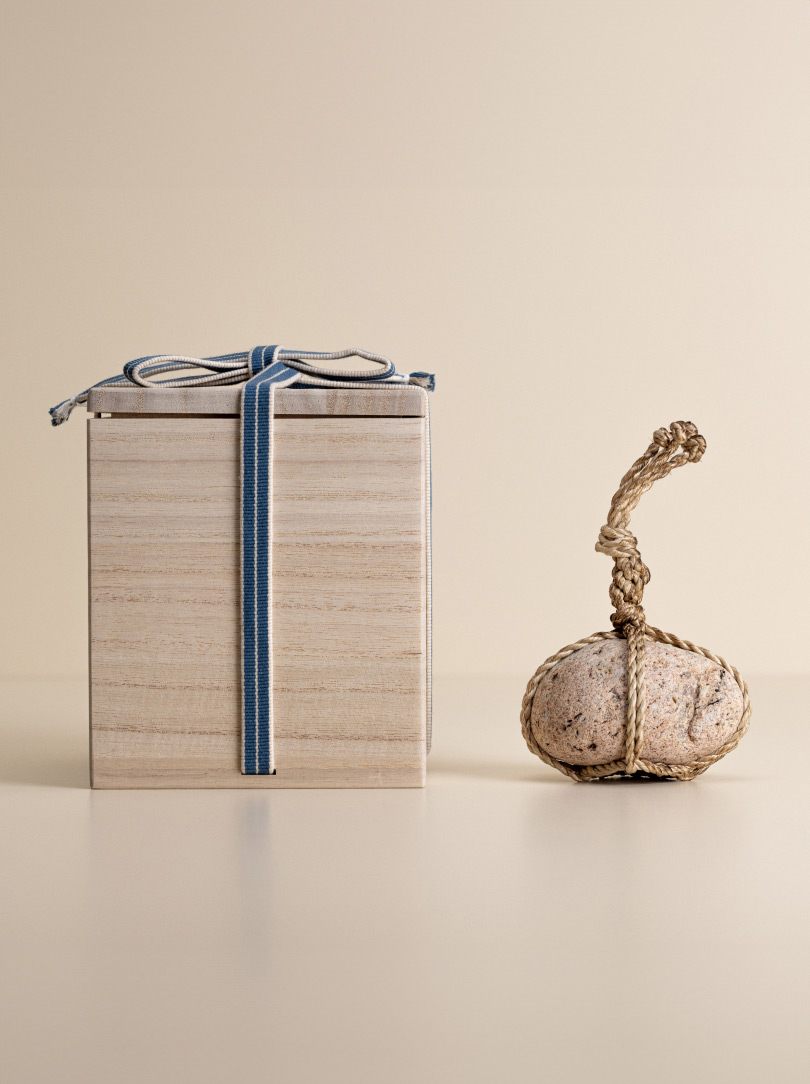 Each stone is delicately wrapped in washi paper, a traditional Japanese paper crafted from the elongated inner fibres of three plants: kozo, mitsumata and gampi. It is presented in a wooden box bearing the artisan’s signature mark. The box itself is made of Paulownia wood, known in East Asia as the ‘empress tree’ and valued for its lightweight but strong properties.