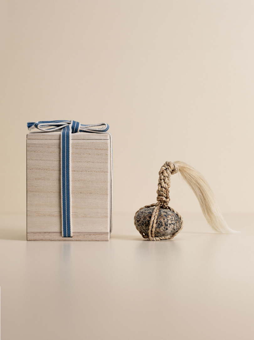 Each stone is delicately wrapped in washi paper, a traditional Japanese paper crafted from the elongated inner fibres of three plants: kozo, mitsumata and gampi. It is presented in a wooden box bearing the artisan’s signature mark. The box itself is made of Paulownia wood, known in East Asia as the ‘empress tree’ and valued for its lightweight but strong properties.