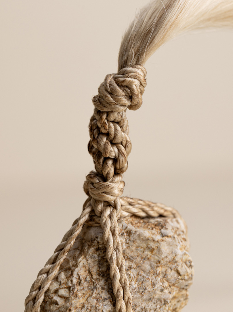 In the quietness of the dawn at one of Kyoto’s oldest Zen temples, Buddhist Zen monk Tosei Shinabe sits in deep meditation, practising ‘zazen’ (‘za’ 坐, Japanese for seated and ‘zen’ 禅 for meditation). His journey takes him to the mystical Awaji Island, the ‘land of birth’ in Japanese mythology, where he selects stones imbued with the earth‘s raw beauty. Wrapped in Seima rope made from the finest Japanese hemp, his za kekkai stones serve as a silent testament, a Dharma tool, to the boundary between two spiritual realms, a line as delicate as it is profound.