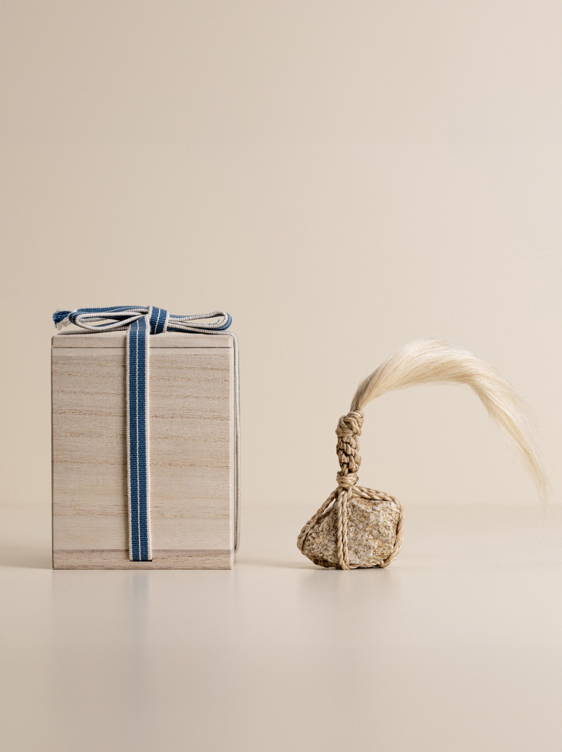 Each stone is delicately wrapped in washi paper, a traditional Japanese paper crafted from the elongated inner fibres of three plants: kozo, mitsumata and gampi. It is presented in a wooden box bearing the artisan’s signature mark. The box itself is made of Paulownia wood, known in East Asia as the ‘empress tree’ and valued for its lightweight but strong properties.