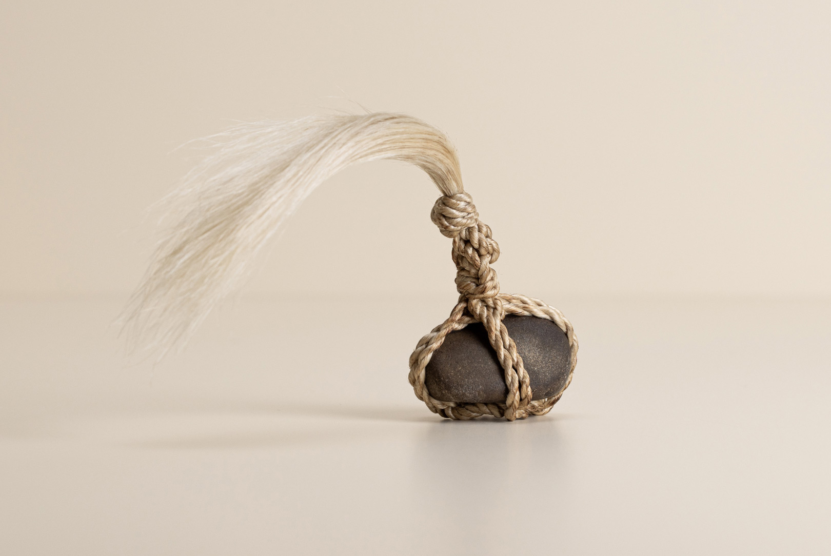 In the quietness of the dawn at one of Kyoto’s oldest Zen temples, Buddhist Zen monk Tosei Shinabe sits in deep meditation, practising ‘zazen’ (‘za’ 坐, Japanese for seated and ‘zen’ 禅 for meditation). His journey takes him to the mystical Awaji Island, the ‘land of birth’ in Japanese mythology, where he selects stones imbued with the earth‘s raw beauty. Wrapped in Seima rope made from the finest Japanese hemp, his za kekkai stones serve as a silent testament, a Dharma tool, to the boundary between two spiritual realms, a line as delicate as it is profound.
