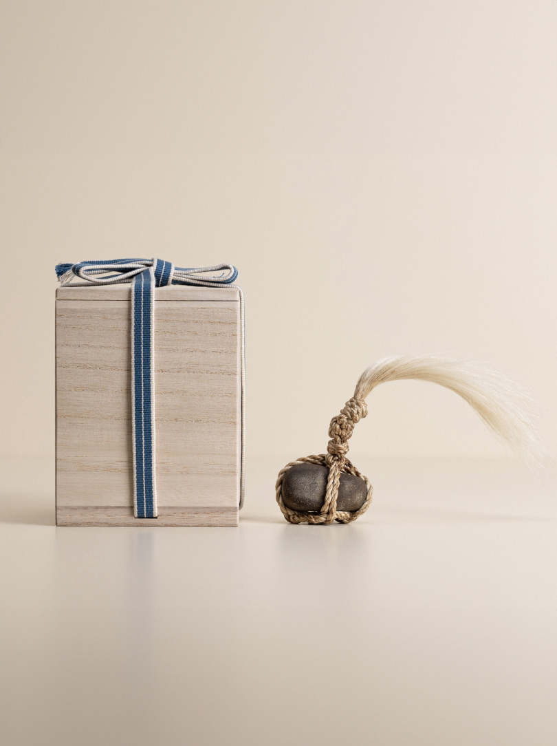 Each stone is delicately wrapped in washi paper, a traditional Japanese paper crafted from the elongated inner fibres of three plants: kozo, mitsumata and gampi. It is presented in a wooden box bearing the artisan’s signature mark. The box itself is made of Paulownia wood, known in East Asia as the ‘empress tree’ and valued for its lightweight but strong properties.