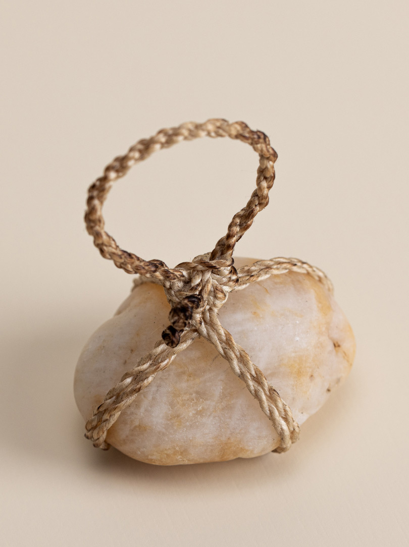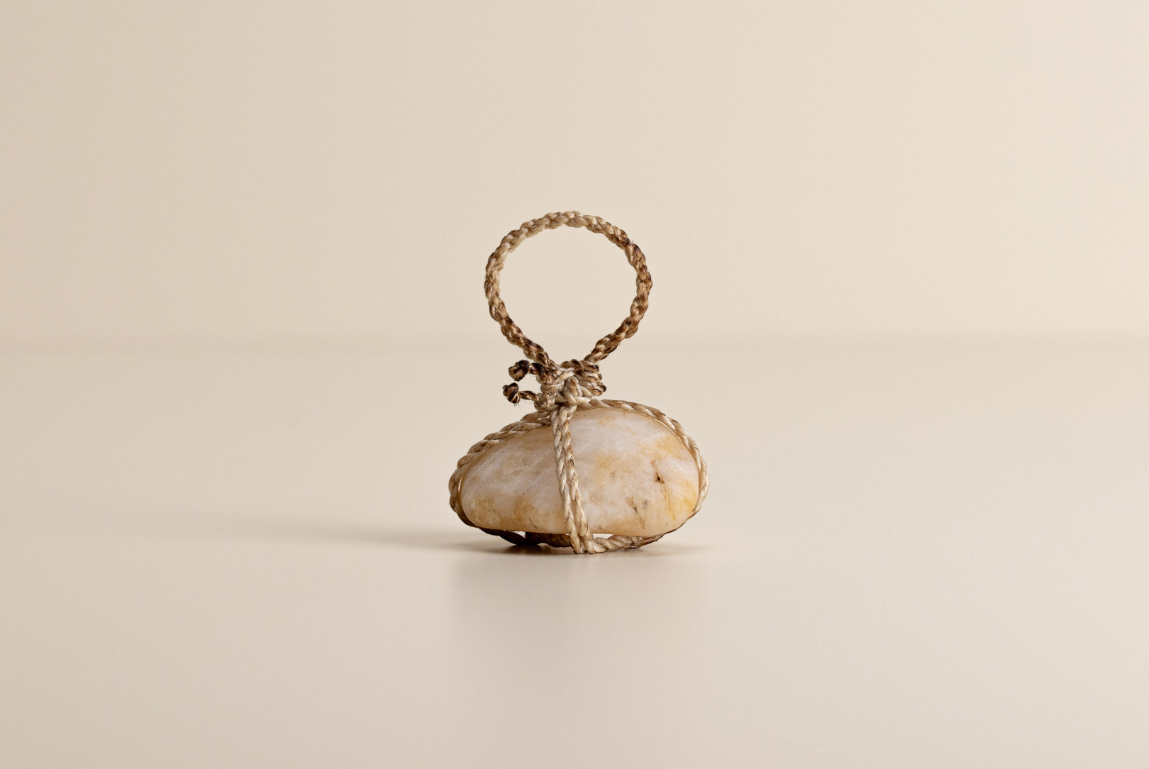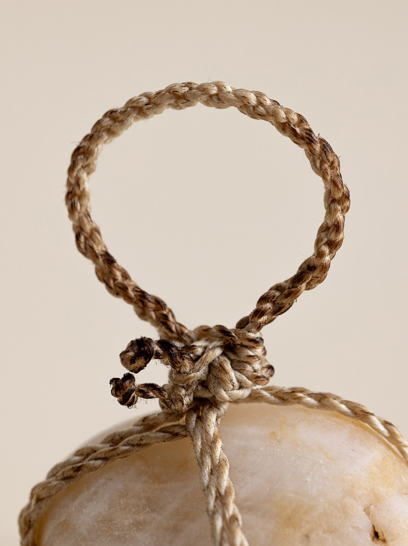 AGOBAY Showroom ZurichOften used in Japanese temples and tea houses, kekkai stones are crafted with intention. They are not merely objects but keepers of spiritual wisdom, echoing the Zen philosophy that ‘heaven, earth and I all share the same origin, and are therefore one’. In Japan, this has led to a spirit of respect for nature and a desire to live in harmony with it since ancient times. The tactile roughness of the stone and the smooth strength of the hemp invite one to ponder the interconnectedness of our existence with nature.