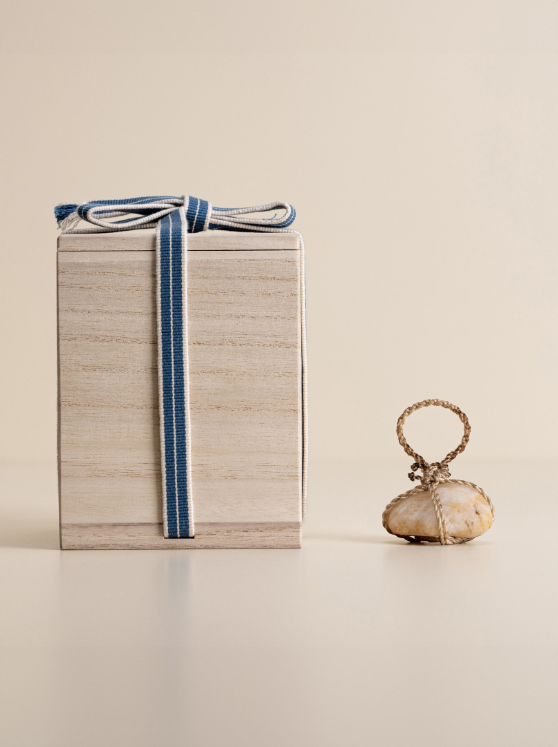 Each stone is delicately wrapped in washi paper, a traditional Japanese paper crafted from the elongated inner fibres of three plants: kozo, mitsumata and gampi. It is presented in a wooden box bearing the artisan’s signature mark. The box itself is made of Paulownia wood, known in East Asia as the ‘empress tree’ and valued for its lightweight but strong properties.