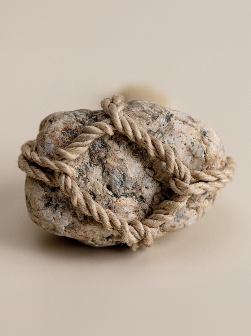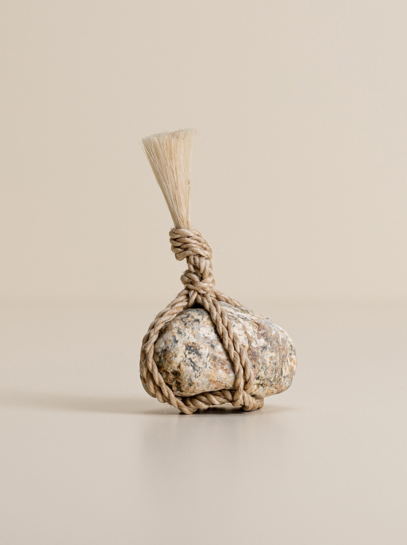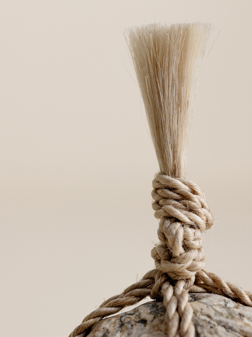 AGOBAY Showroom ZurichOften used in Japanese temples and tea houses, kekkai stones are crafted with intention. They are not merely objects but keepers of spiritual wisdom, echoing the Zen philosophy that ‘heaven, earth and I all share the same origin, and are therefore one’. In Japan, this has led to a spirit of respect for nature and a desire to live in harmony with it since ancient times. The tactile roughness of the stone and the smooth strength of the hemp invite one to ponder the interconnectedness of our existence with nature.