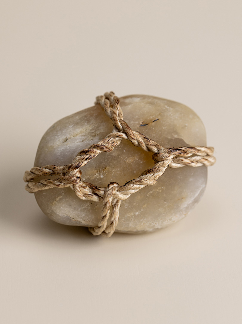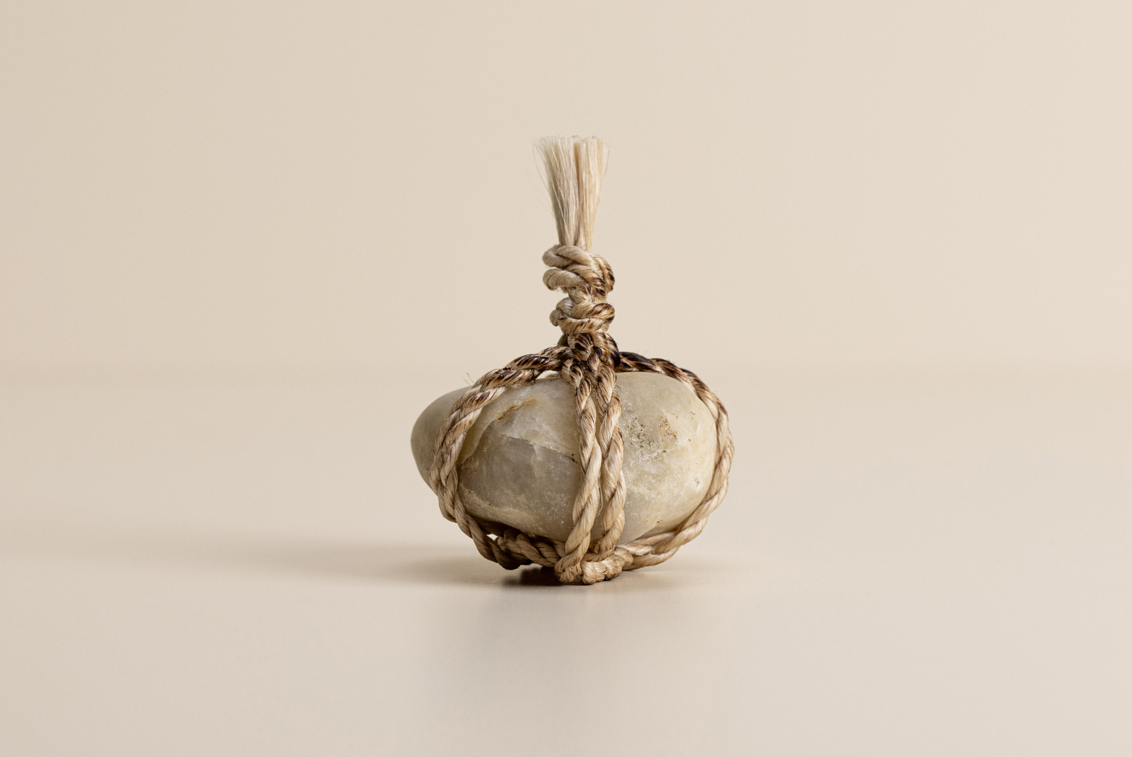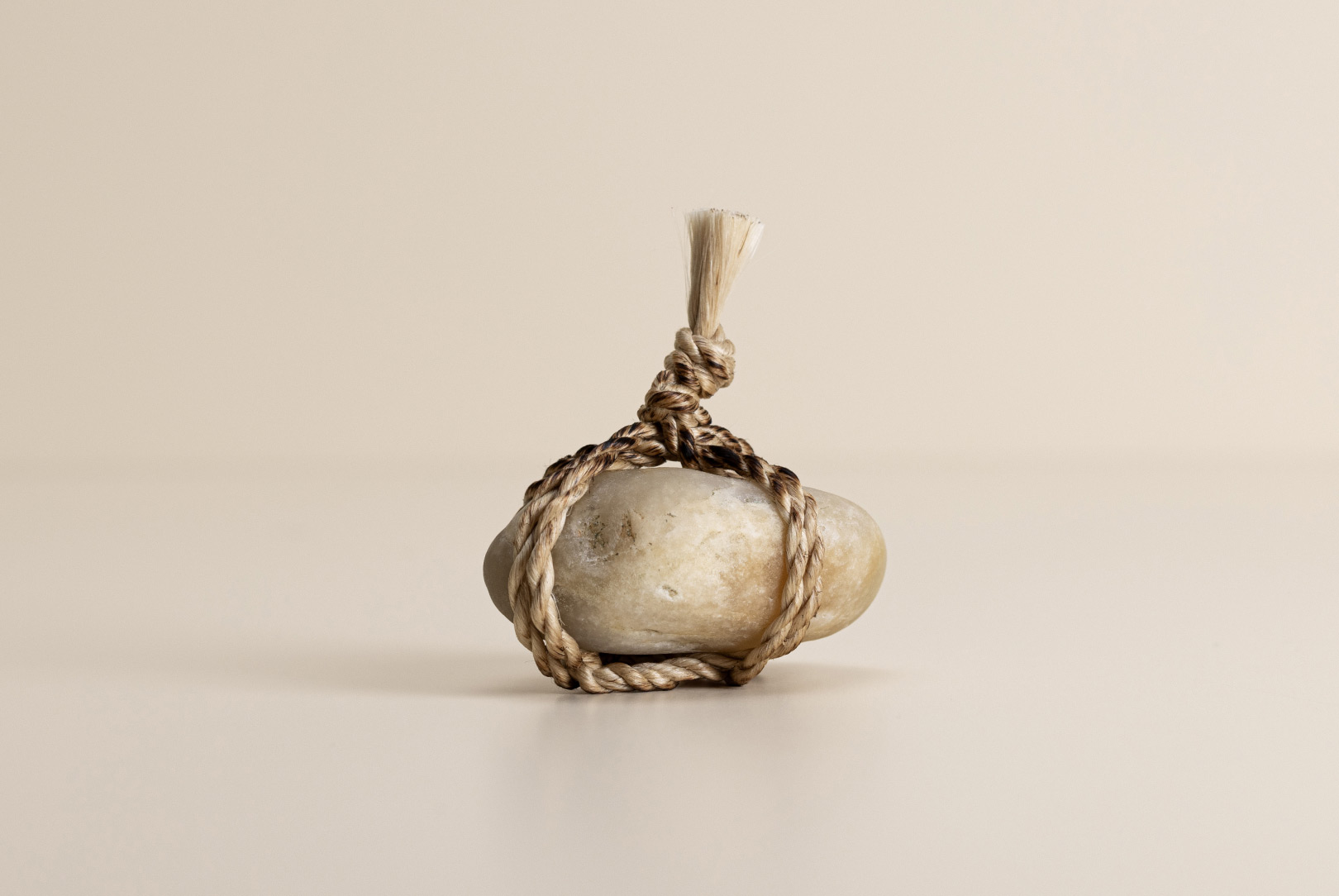 AGOBAY Showroom ZurichOften used in Japanese temples and tea houses, ‘kekkai’ stones are crafted with intention. They are not merely objects but keepers of spiritual wisdom, echoing the Zen philosophy that ‘heaven, earth and I all share the same origin, and are therefore one’. In Japan, this has led to a spirit of respect for nature and a desire to live in harmony with it since ancient times. The tactile roughness of the stone and the smooth strength of the hemp invite one to ponder the interconnectedness of our existence with nature.
