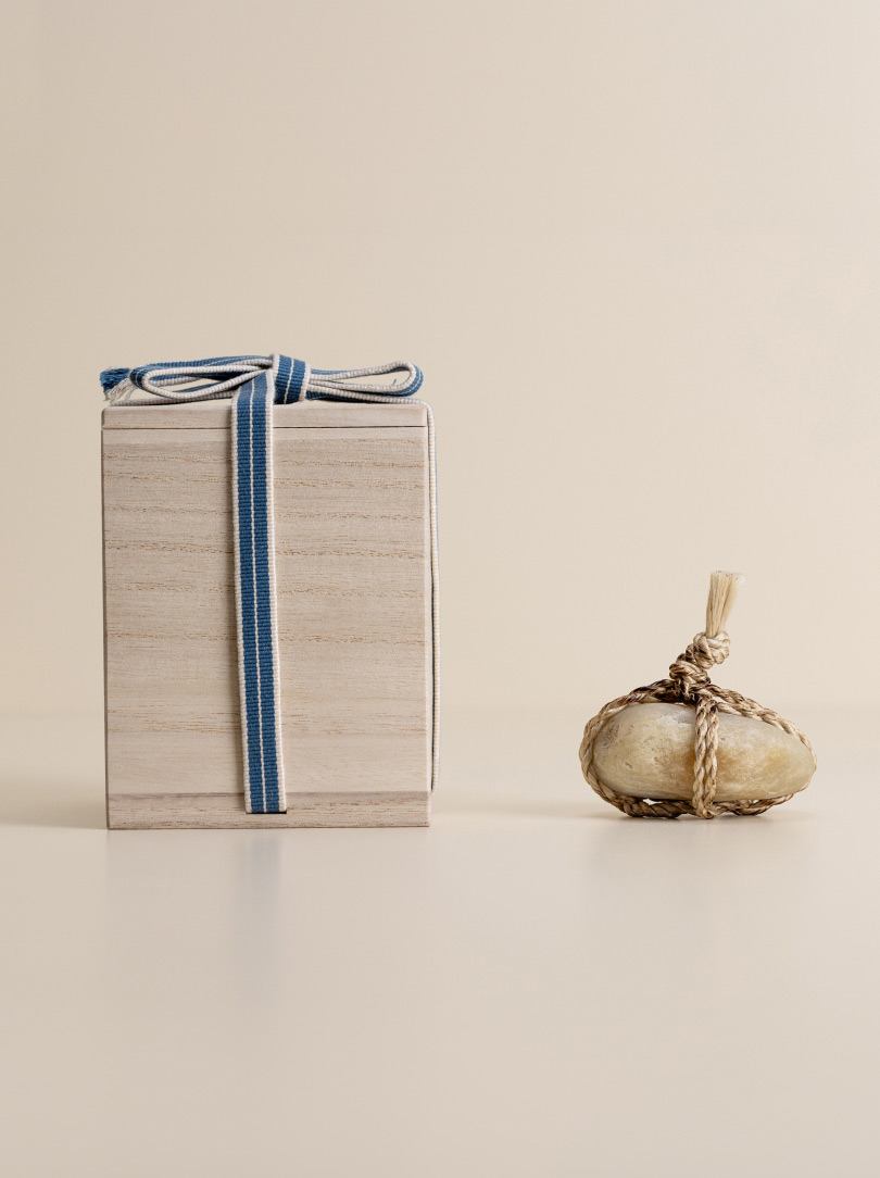 Each stone is delicately wrapped in washi paper, a traditional Japanese paper crafted from the elongated inner fibres of three plants: kozo, mitsumata and gampi. It is presented in a wooden box bearing the artisan’s signature mark. The box itself is made of Paulownia wood, known in East Asia as the ‘empress tree’ and valued for its lightweight but strong properties.