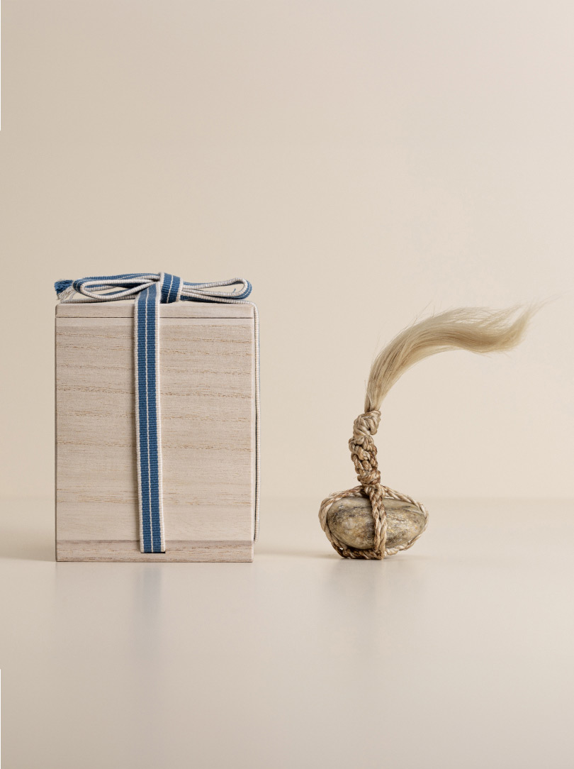 Each stone is delicately wrapped in washi paper, a traditional Japanese paper crafted from the elongated inner fibres of three plants: kozo, mitsumata and gampi. It is presented in a wooden box bearing the artisan’s signature mark. The box itself is made of Paulownia wood, known in East Asia as the ‘empress tree’ and valued for its lightweight but strong properties.