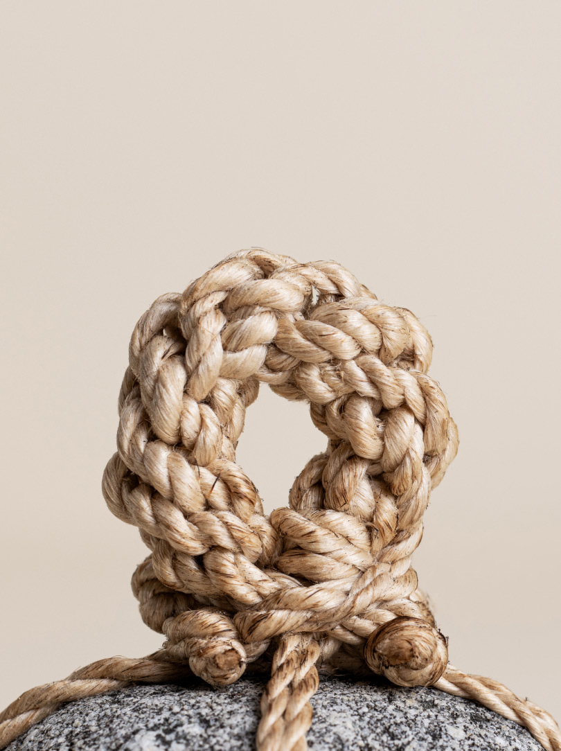 In the quietness of the dawn at one of Kyoto’s oldest Zen temples, Buddhist Zen monk Tosei Shinabe sits in deep meditation, practising ‘zazen’ (‘za’ 坐, Japanese for seated and ‘zen’ 禅 for meditation). His journey takes him to the mystical Awaji Island, the ‘land of birth’ in Japanese mythology, where he selects stones imbued with the earth‘s raw beauty. Wrapped in Seima rope made from the finest Japanese hemp, his ‘za kekkai’ stones serve as a silent testament, a Dharma tool, to the boundary between two spiritual realms, a line as delicate as it is profound.