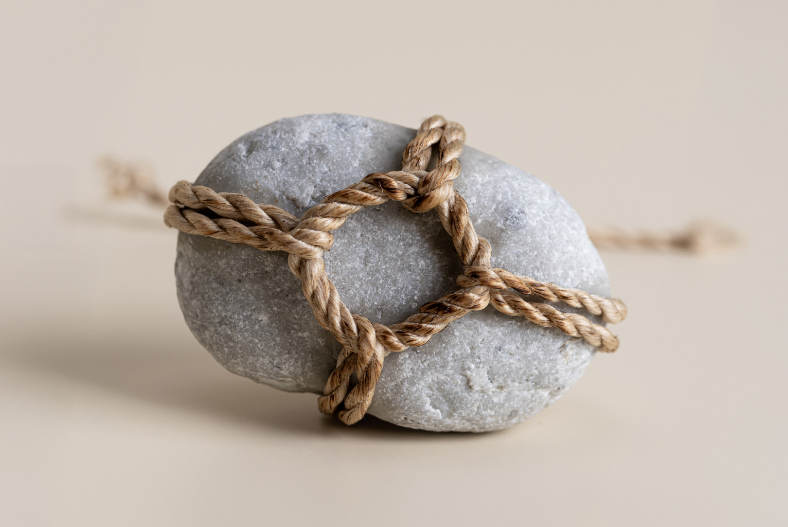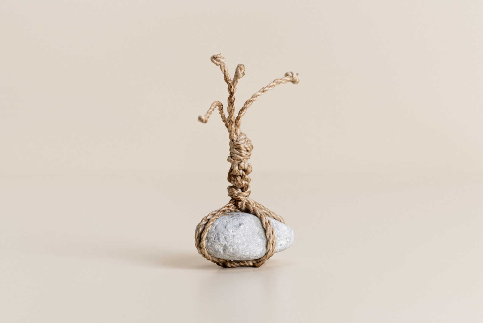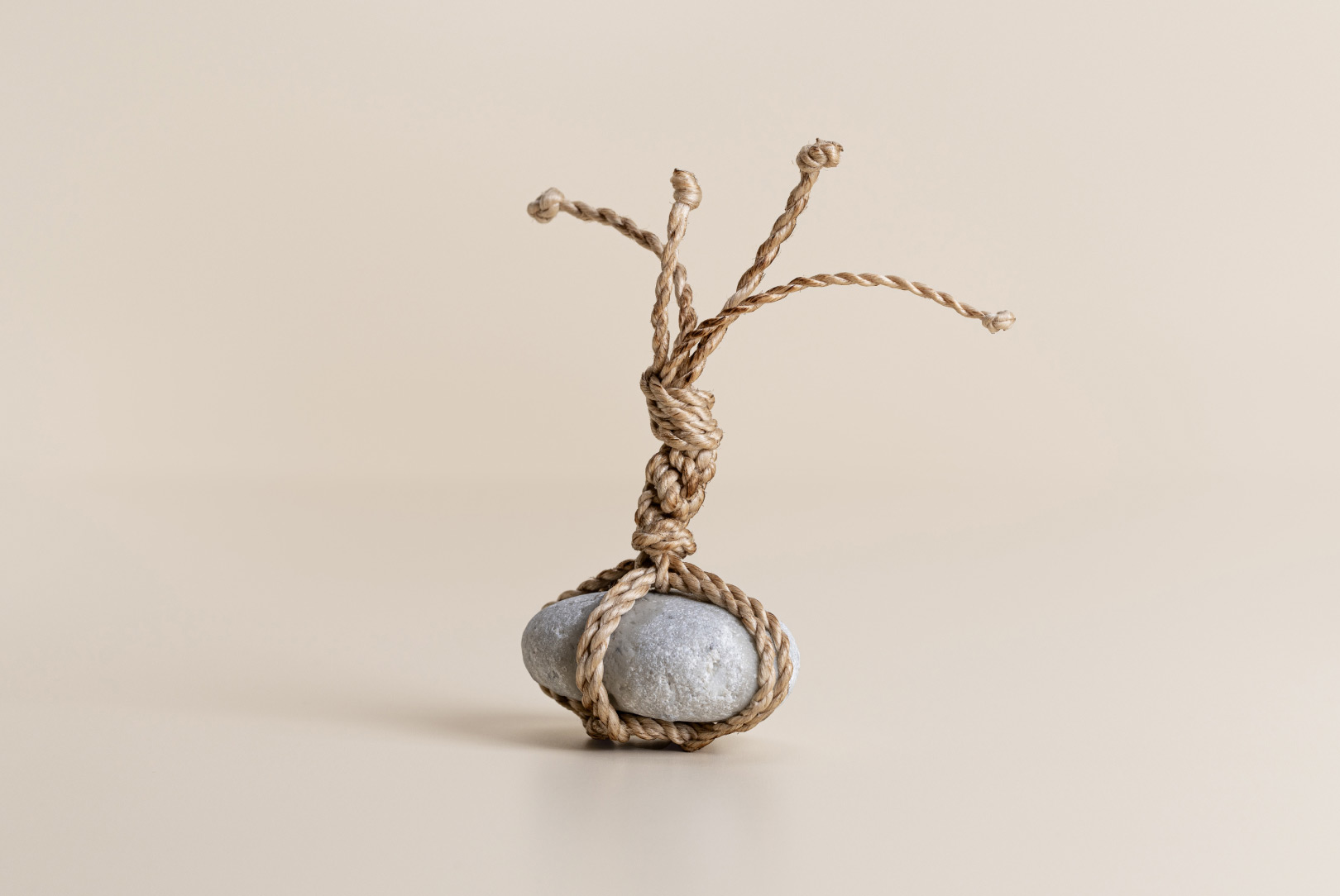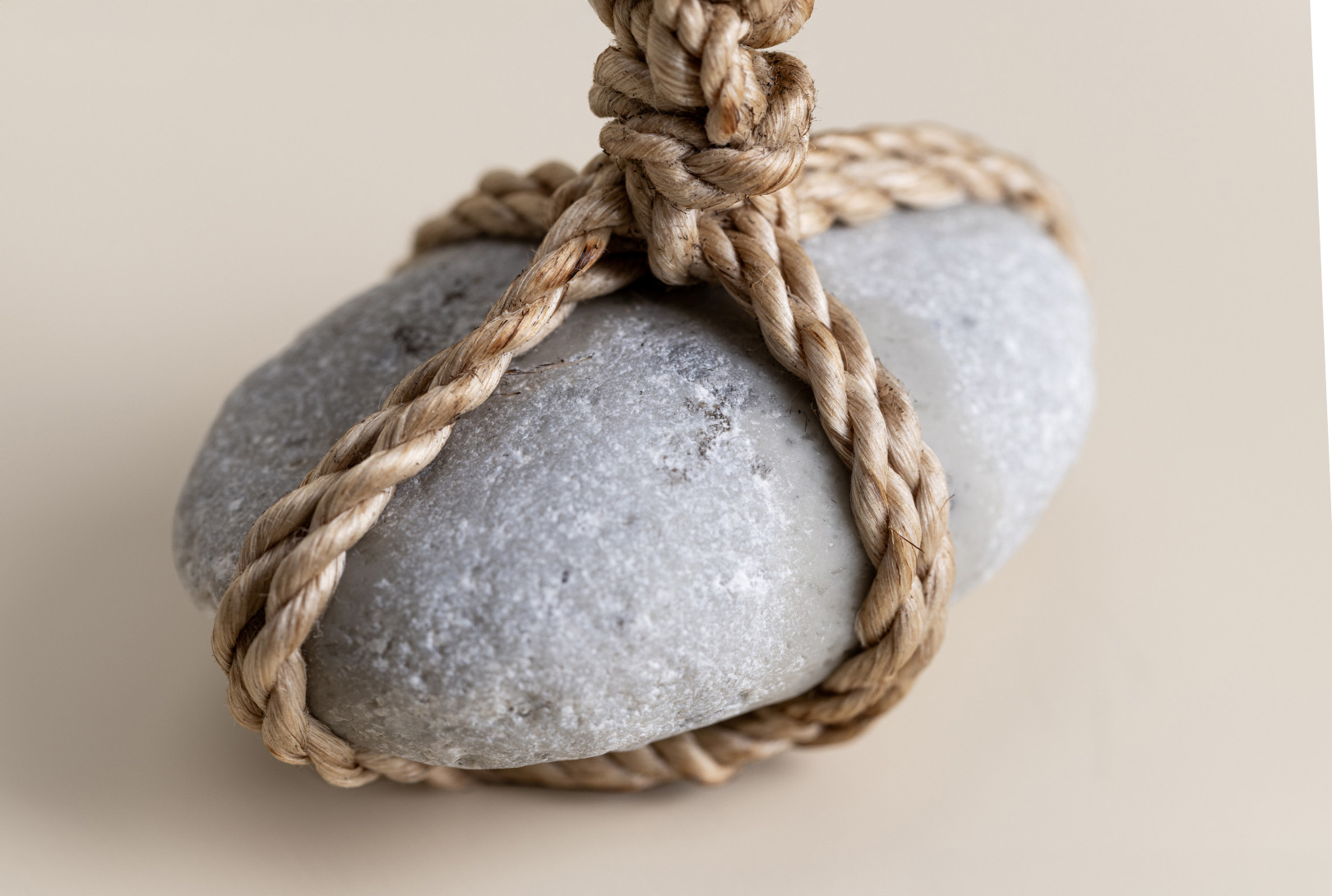 AGOBAY Showroom ZurichOften used in Japanese temples and tea houses, kekkai stones are crafted with intention. They are not merely objects but keepers of spiritual wisdom, echoing the Zen philosophy that ‘heaven, earth and I all share the same origin, and are therefore one’. In Japan, this has led to a spirit of respect for nature and a desire to live in harmony with it since ancient times. The tactile roughness of the stone and the smooth strength of the hemp invite one to ponder the interconnectedness of our existence with nature.