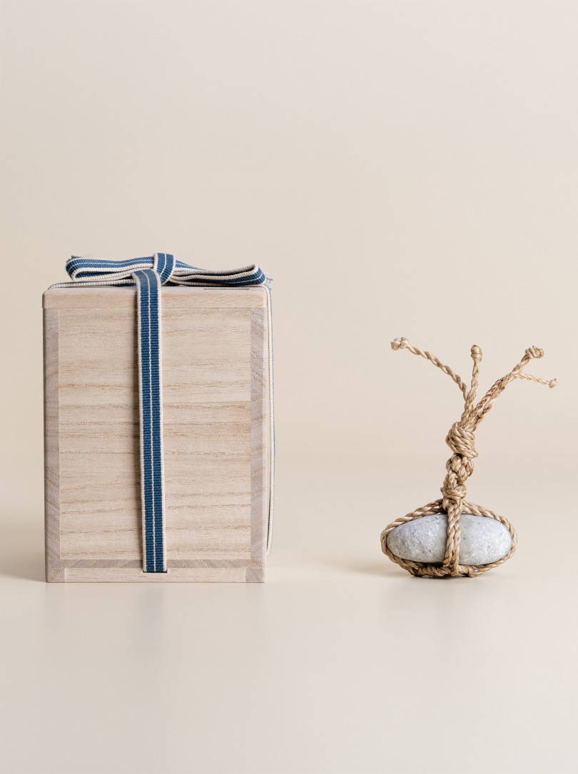 Each stone is delicately wrapped in washi paper, a traditional Japanese paper crafted from the elongated inner fibres of three plants: kozo, mitsumata and gampi. It is presented in a wooden box bearing the artisan’s signature mark. The box itself is made of Paulownia wood, known in East Asia as the ‘empress tree’ and valued for its lightweight but strong properties.