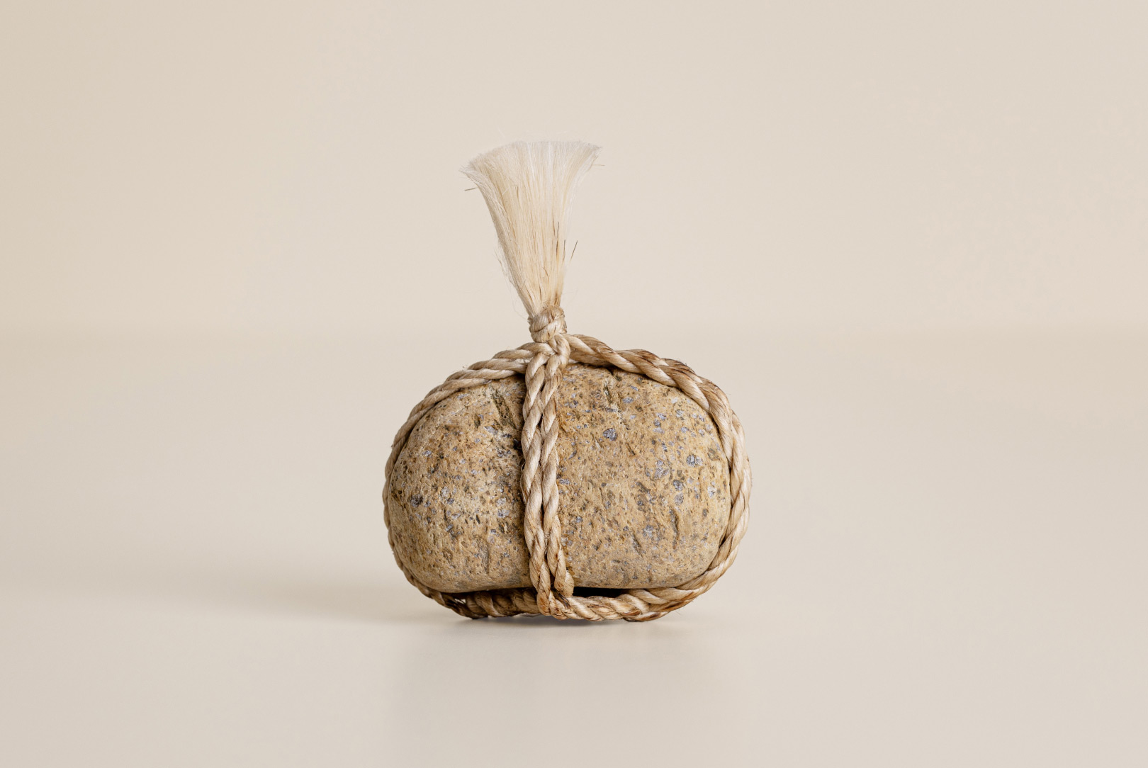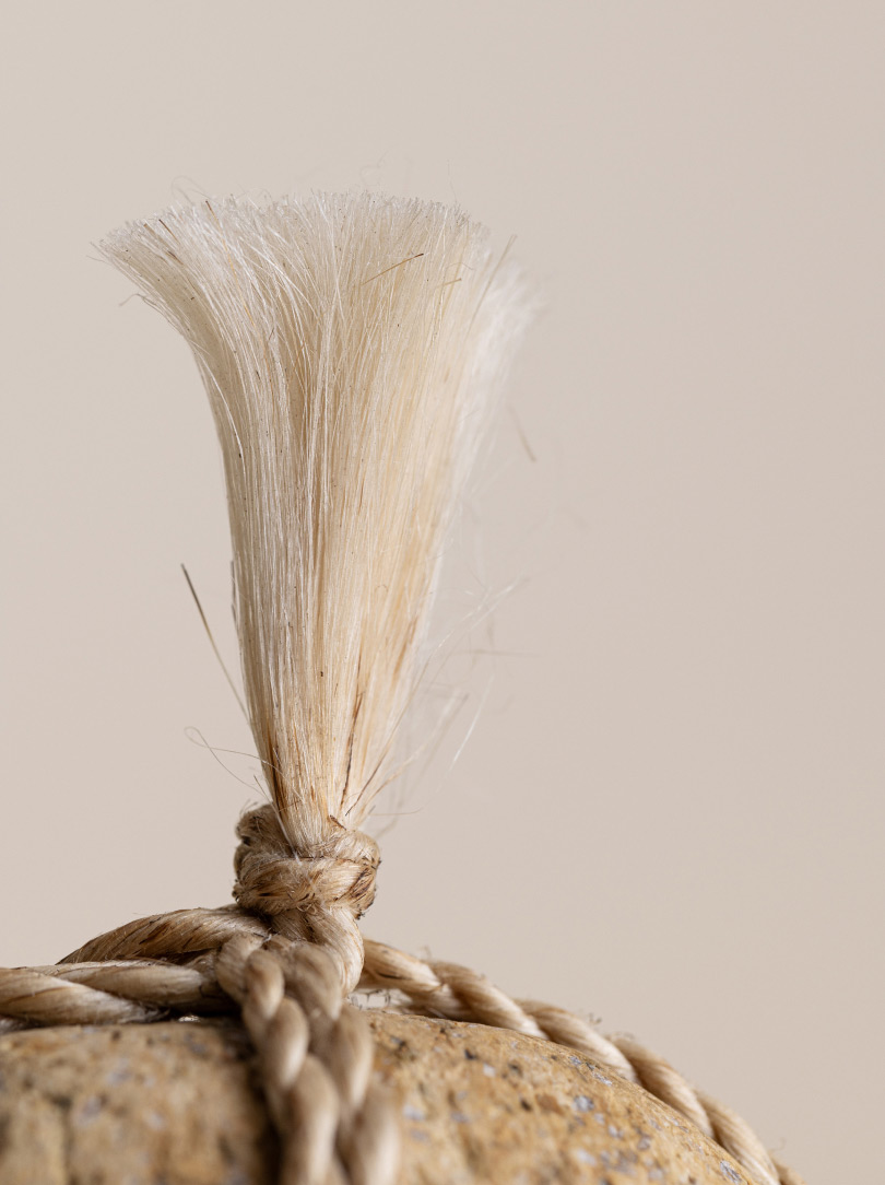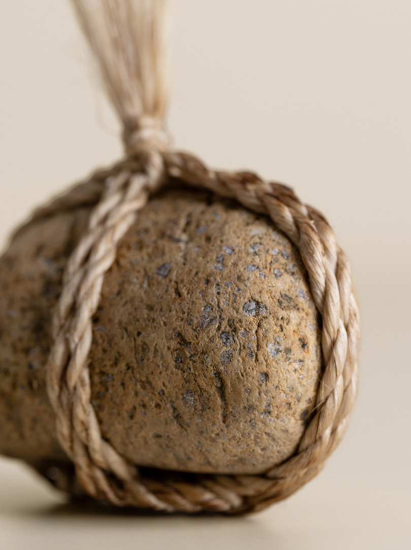 AGOBAY Showroom ZurichOften used in Japanese temples and tea houses, kekkai stones are crafted with intention. They are not merely objects but keepers of spiritual wisdom, echoing the Zen philosophy that ‘heaven, earth and I all share the same origin, and are therefore one’. In Japan, this has led to a spirit of respect for nature and a desire to live in harmony with it since ancient times. The tactile roughness of the stone and the smooth strength of the hemp invite one to ponder the interconnectedness of our existence with nature.