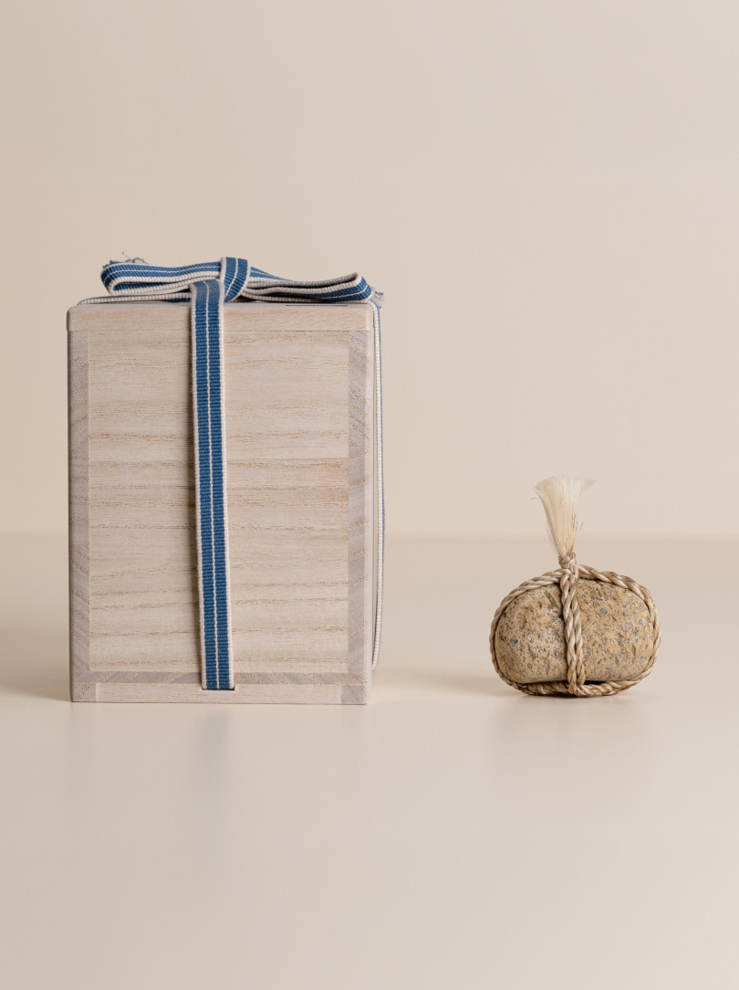 Each stone is delicately wrapped in washi paper, a traditional Japanese paper crafted from the elongated inner fibres of three plants: kozo, mitsumata and gampi. It is presented in a wooden box bearing the artisan’s signature mark. The box itself is made of Paulownia wood, known in East Asia as the ‘empress tree’ and valued for its lightweight but strong properties.
