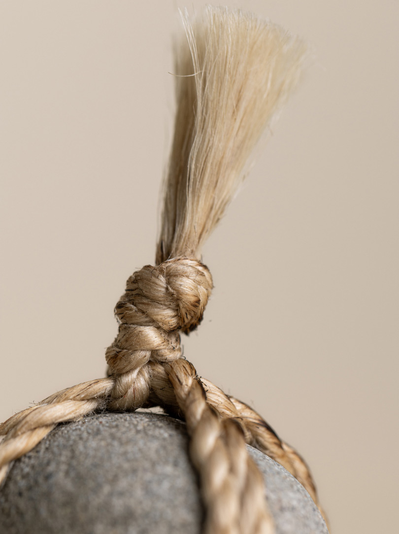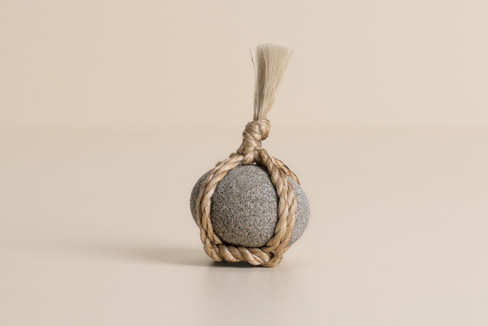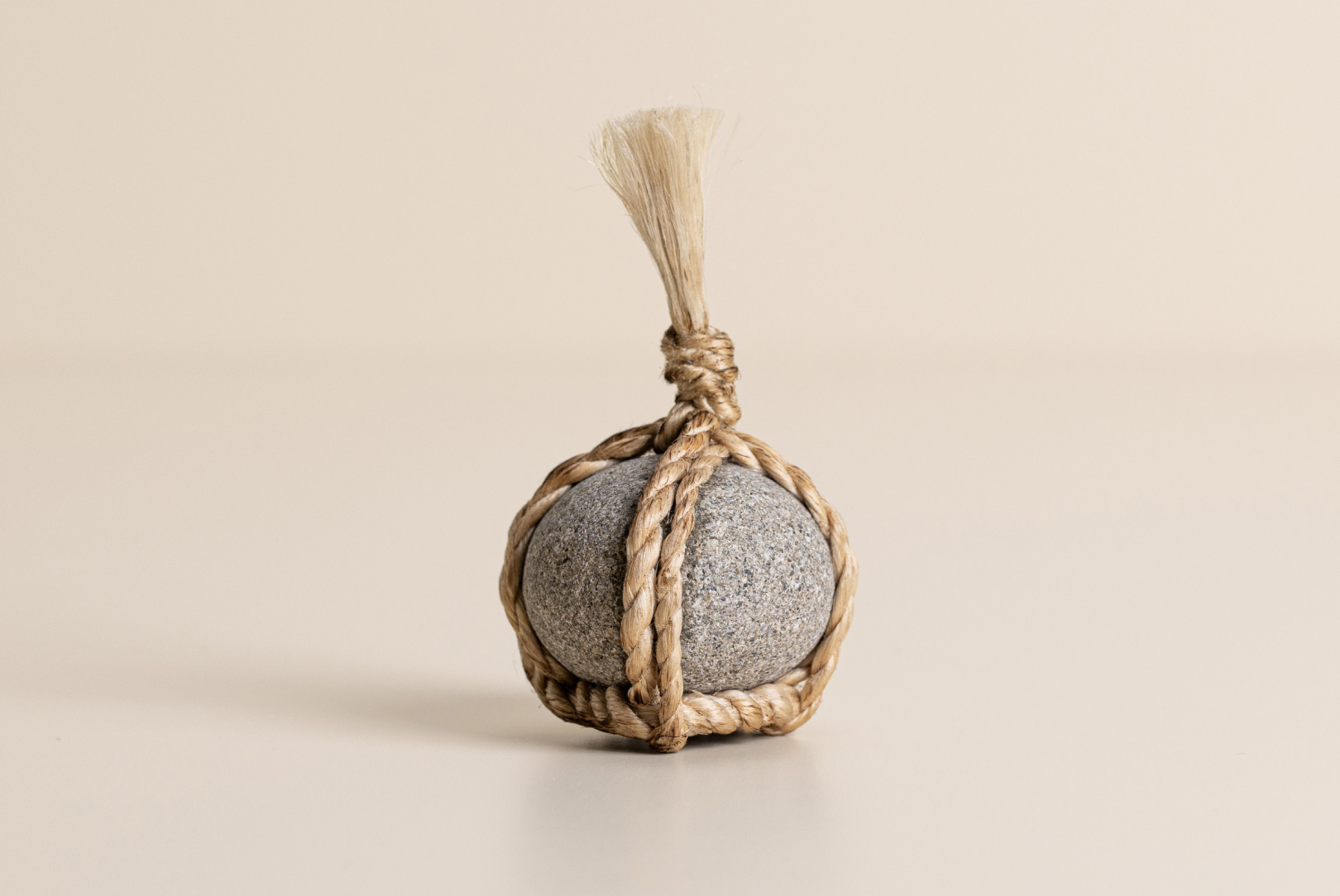 AGOBAY Showroom ZurichOften used in Japanese temples and tea houses, kekkai stones are crafted with intention. They are not merely objects but keepers of spiritual wisdom, echoing the Zen philosophy that ‘heaven, earth and I all share the same origin, and are therefore one’. In Japan, this has led to a spirit of respect for nature and a desire to live in harmony with it since ancient times. The tactile roughness of the stone and the smooth strength of the hemp invite one to ponder the interconnectedness of our existence with nature.