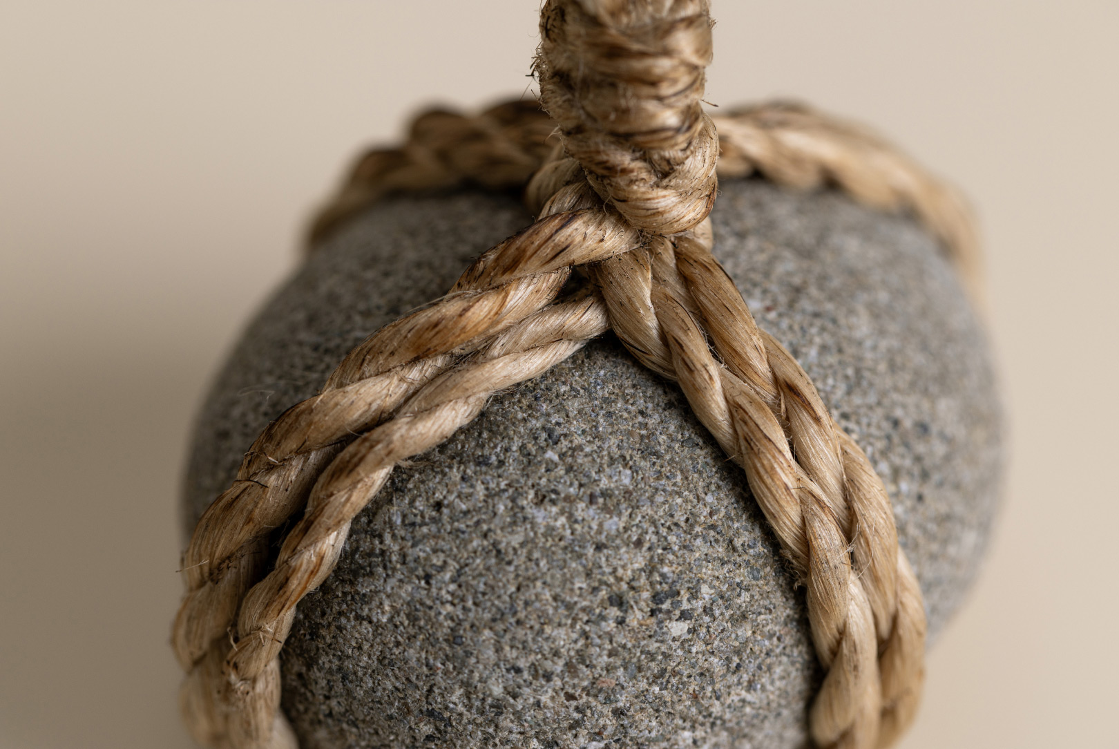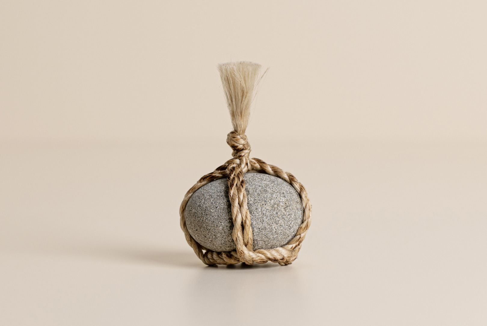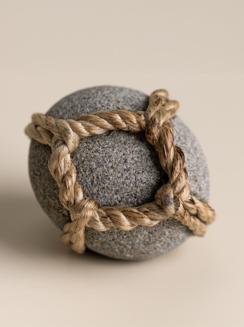 AGOBAY Showroom ZurichOften used in Japanese temples and tea houses, kekkai stones are crafted with intention. They are not merely objects but keepers of spiritual wisdom, echoing the Zen philosophy that ‘heaven, earth and I all share the same origin, and are therefore one’. In Japan, this has led to a spirit of respect for nature and a desire to live in harmony with it since ancient times. The tactile roughness of the stone and the smooth strength of the hemp invite one to ponder the interconnectedness of our existence with nature.