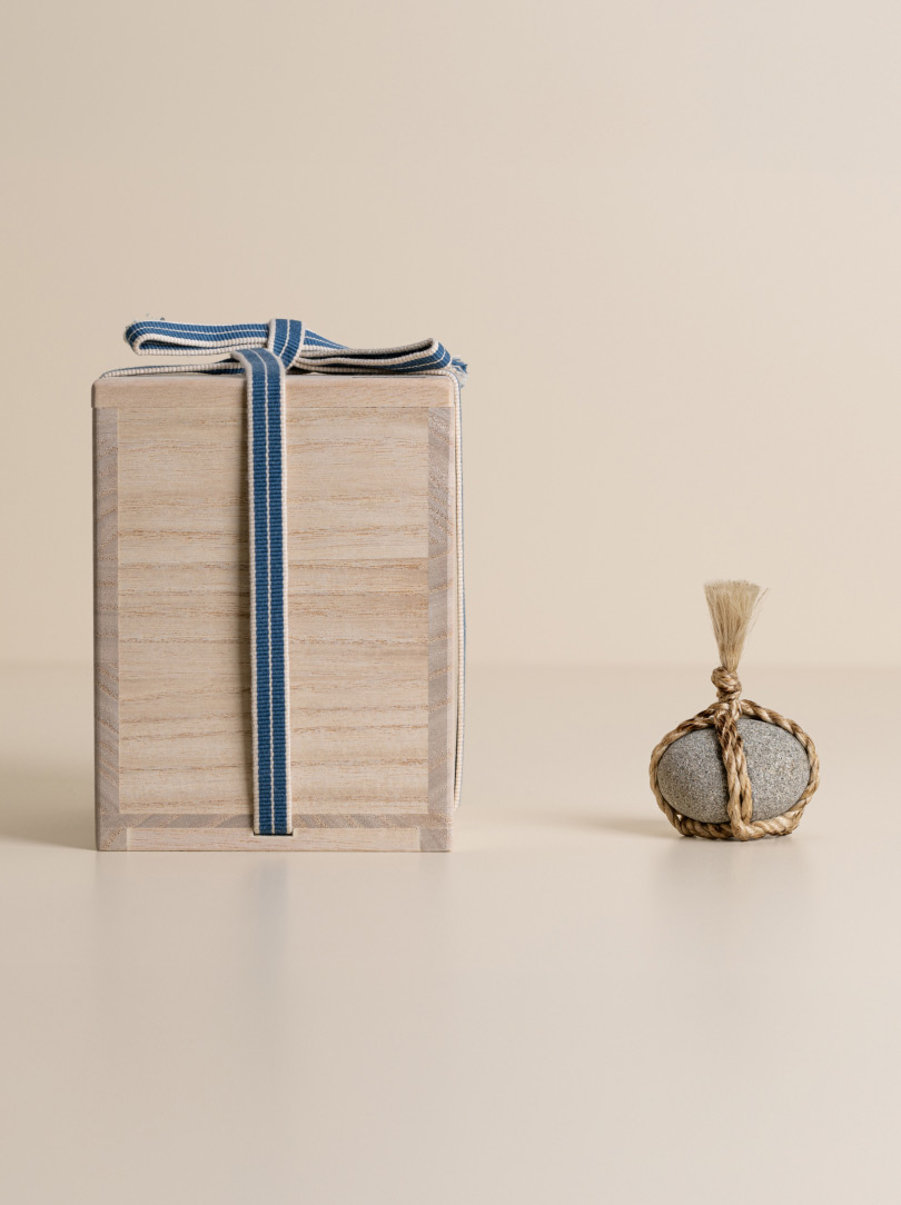 Each stone is delicately wrapped in washi paper, a traditional Japanese paper crafted from the elongated inner fibres of three plants: kozo, mitsumata and gampi. It is presented in a wooden box bearing the artisan’s signature mark. The box itself is made of Paulownia wood, known in East Asia as the ‘empress tree’ and valued for its lightweight but strong properties.