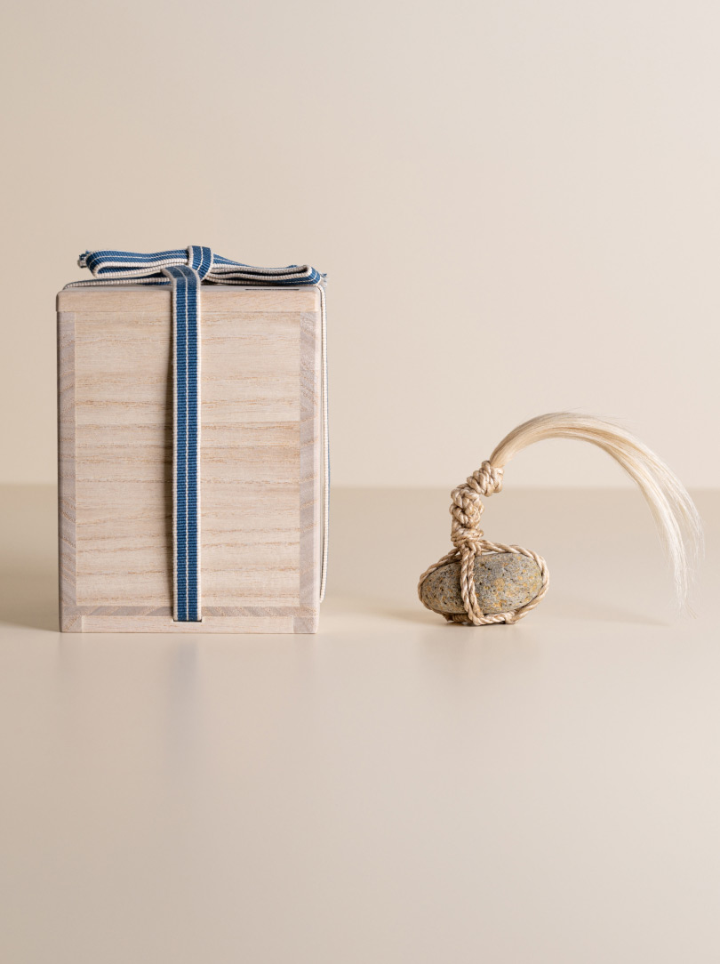 Each stone is delicately wrapped in washi paper, a traditional Japanese paper crafted from the elongated inner fibres of three plants: kozo, mitsumata and gampi. It is presented in a wooden box bearing the artisan’s signature mark. The box itself is made of Paulownia wood, known in East Asia as the ‘empress tree’ and valued for its lightweight but strong properties.