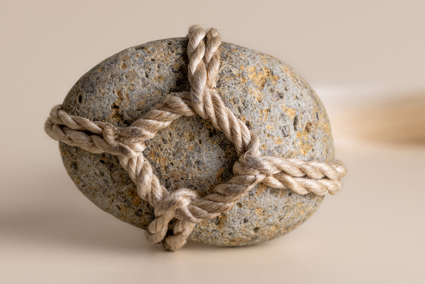 In the quietness of the dawn at one of Kyoto’s oldest Zen temples, Buddhist Zen monk Tosei Shinabe sits in deep meditation, practising ‘zazen’ (‘za’ 坐, Japanese for seated and ‘zen’ 禅 for meditation). His journey takes him to the mystical Awaji Island, the ‘land of birth’ in Japanese mythology, where he selects stones imbued with the earth‘s raw beauty. Wrapped in Seima rope made from the finest Japanese hemp, his za kekkai stones serve as a silent testament, a Dharma tool, to the boundary between two spiritual realms, a line as delicate as it is profound.