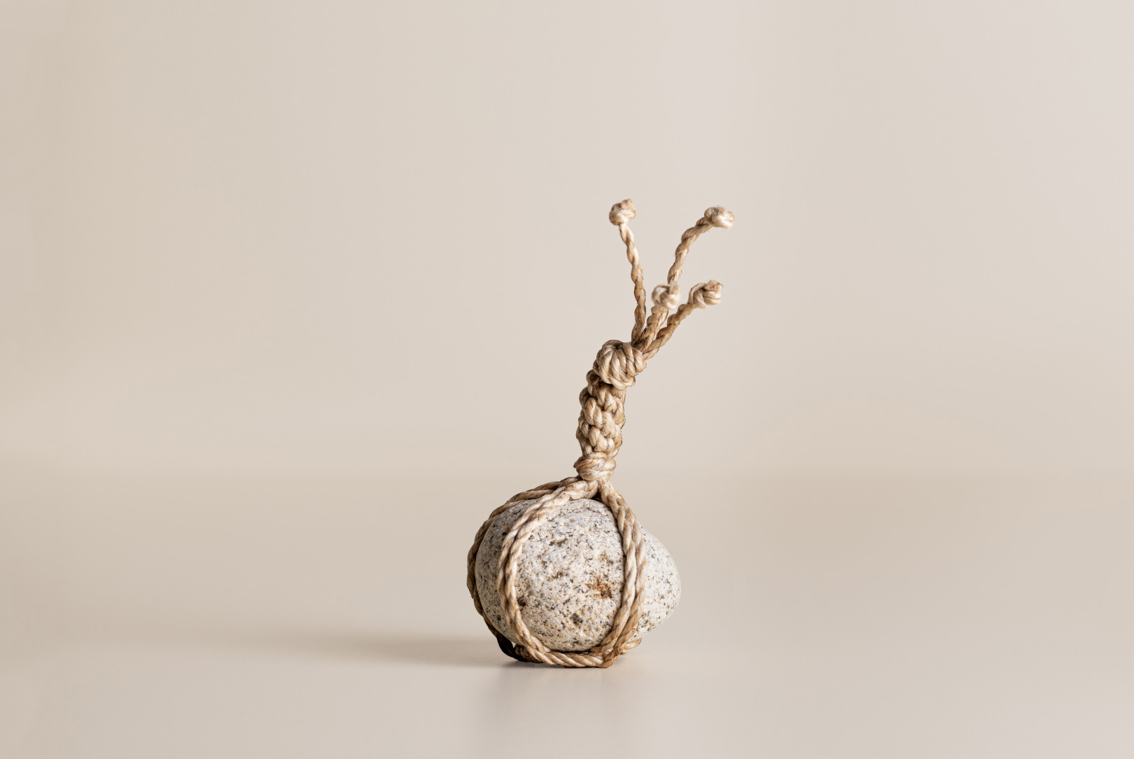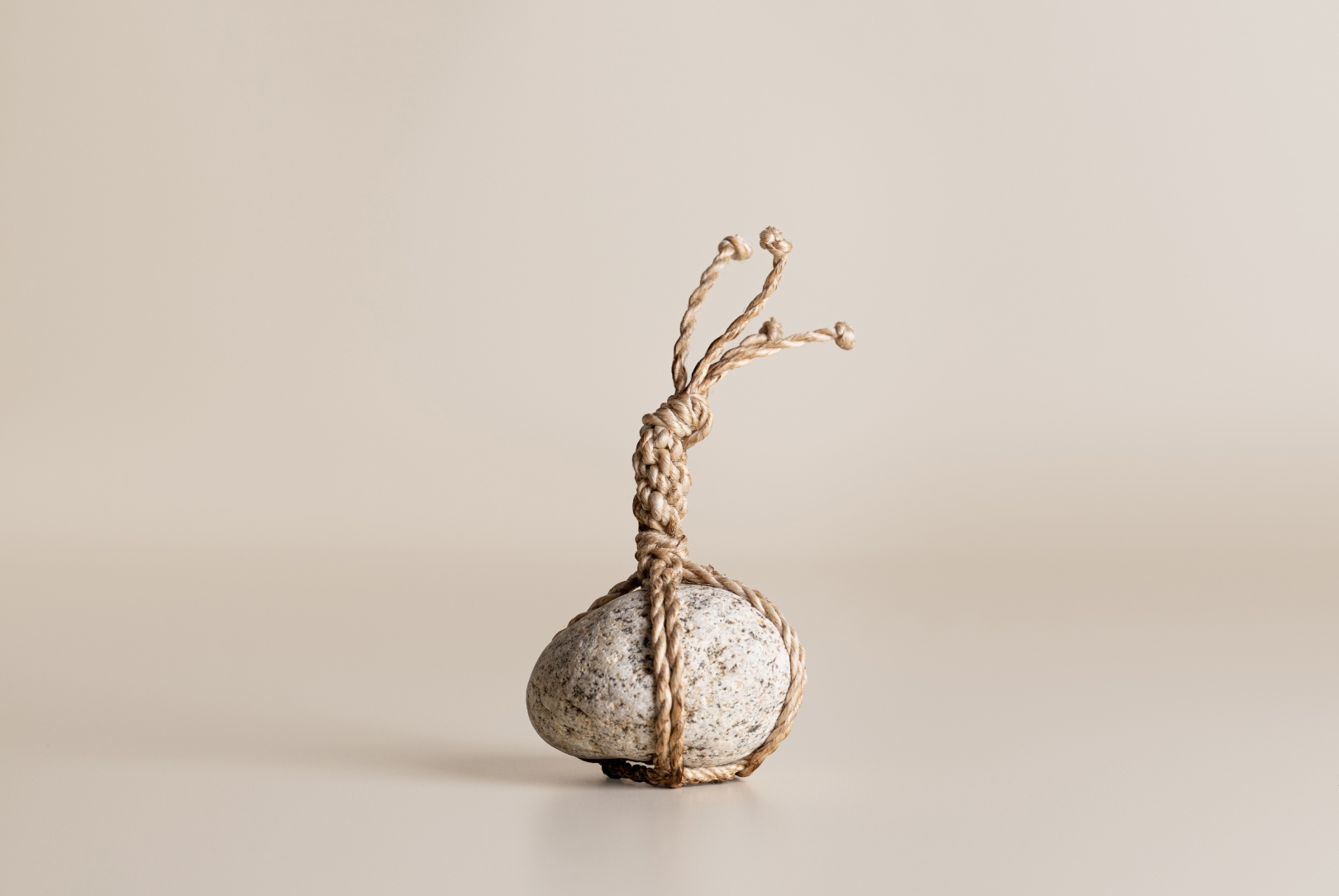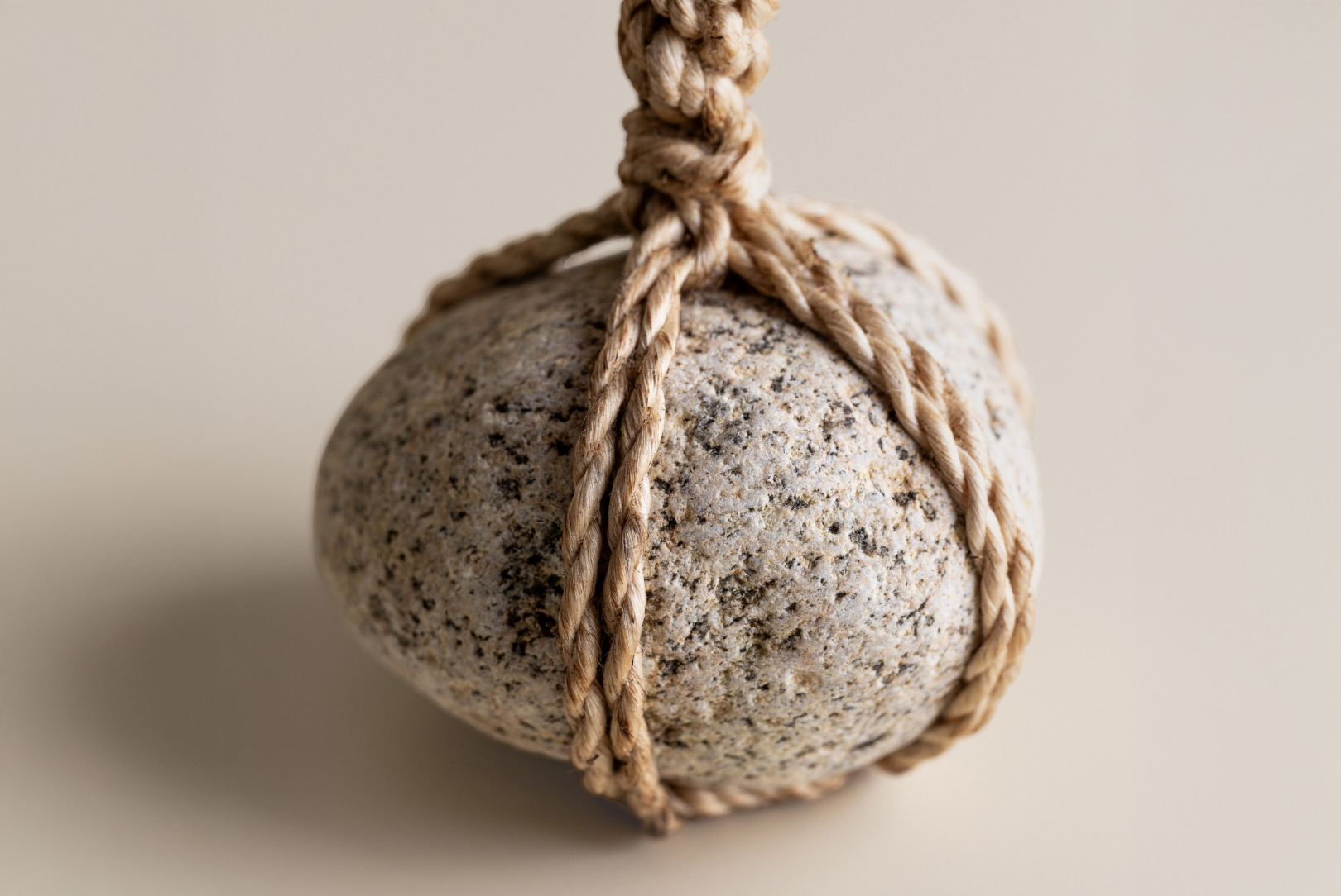 AGOBAY Showroom ZurichOften used in Japanese temples and tea houses, kekkai stones are crafted with intention. They are not merely objects but keepers of spiritual wisdom, echoing the Zen philosophy that ‘heaven, earth and I all share the same origin, and are therefore one’. In Japan, this has led to a spirit of respect for nature and a desire to live in harmony with it since ancient times. The tactile roughness of the stone and the smooth strength of the hemp invite one to ponder the interconnectedness of our existence with nature.