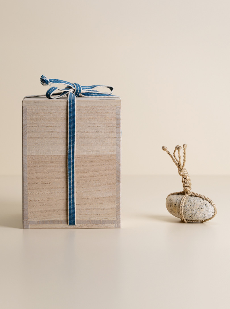 Each stone is delicately wrapped in washi paper, a traditional Japanese paper crafted from the elongated inner fibres of three plants: kozo, mitsumata and gampi. It is presented in a wooden box bearing the artisan’s signature mark. The box itself is made of Paulownia wood, known in East Asia as the ‘empress tree’ and valued for its lightweight but strong properties.