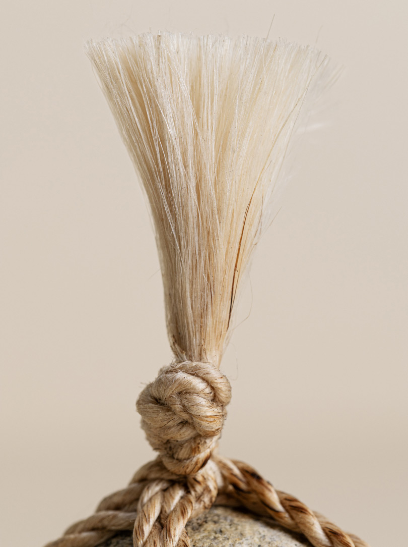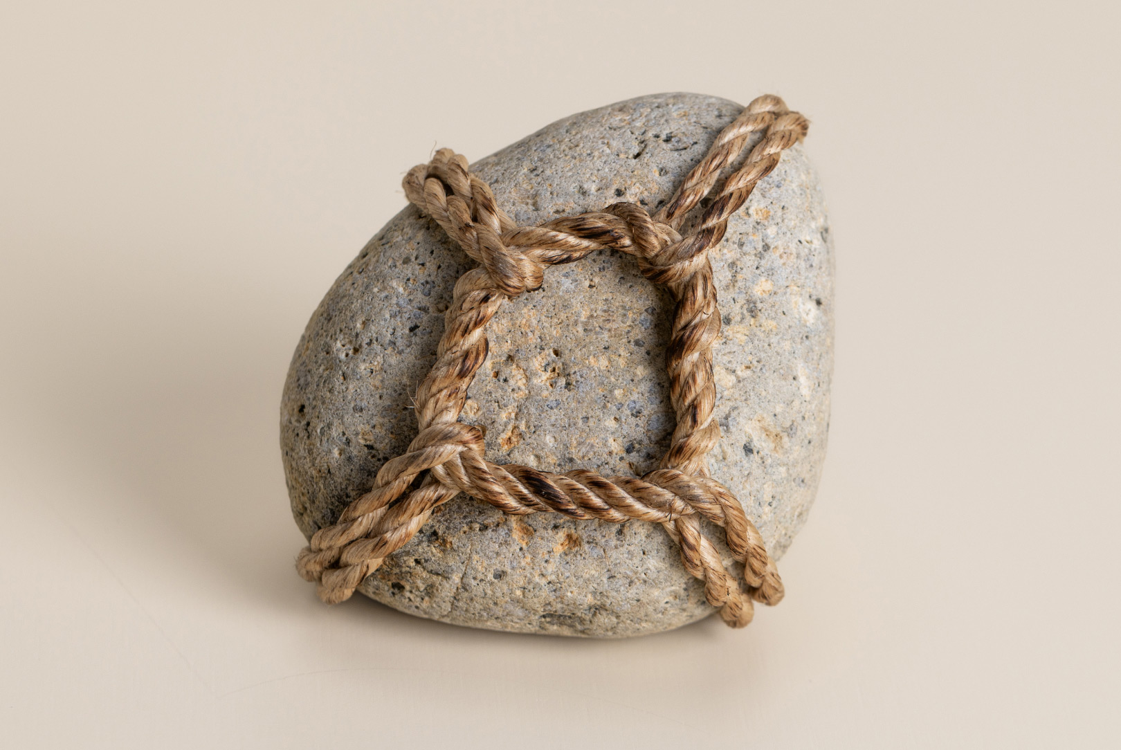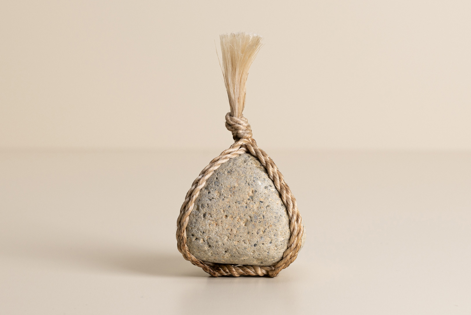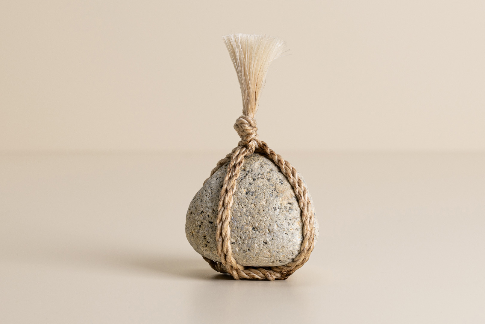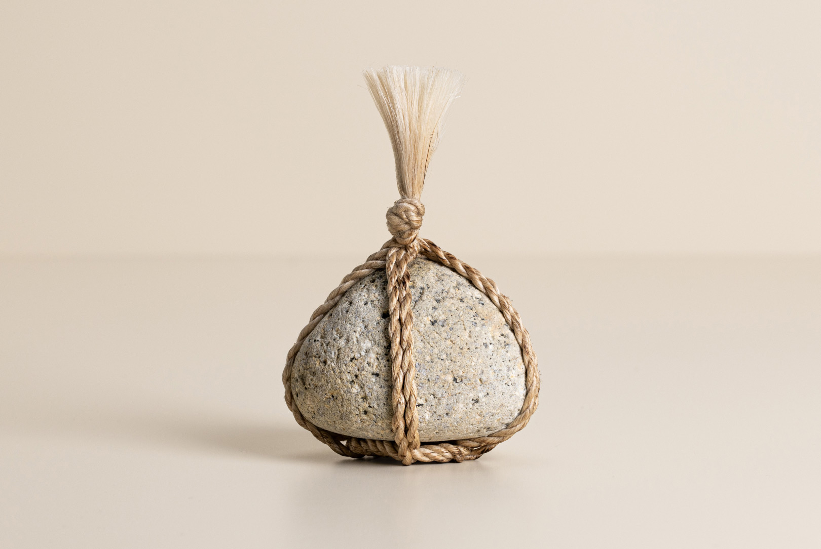 In the quietness of the dawn at one of Kyoto’s oldest Zen temples, Buddhist Zen monk Tosei Shinabe sits in deep meditation, practising ‘zazen’ (‘za’ 坐, Japanese for seated and ‘zen’ 禅 for meditation). His journey takes him to the mystical Awaji Island, the ‘land of birth’ in Japanese mythology, where he selects stones imbued with the earth’s raw beauty. Wrapped in Seima rope made from the finest Japanese hemp, his ‘za kekkai’ stones serve as a silent testament, a Dharma tool, to the boundary between two spiritual realms, a line as delicate as it is profound.